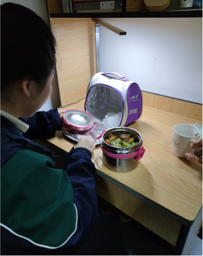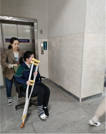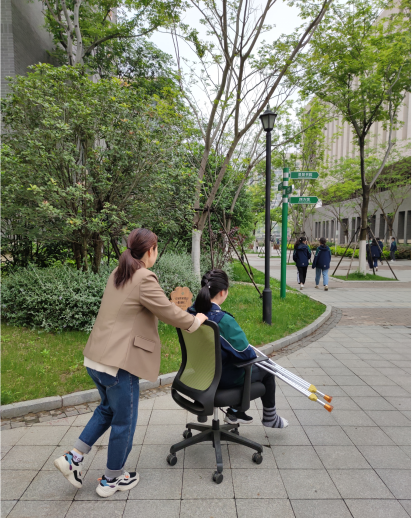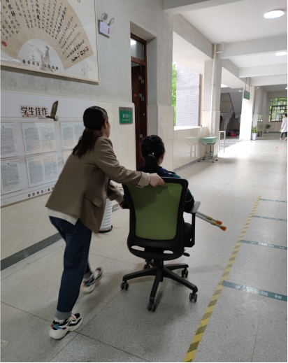 近日,1920班的一位女同学不慎受伤,腿脚不方便,只能靠着拐杖和轮椅行动。刘老师义不容辞挺身而出,悉心照料受伤同学。每天十一点三十五,刘老师准时去食堂,帮女同学打好饭菜,等待孩子放学,再送孩子回午休区宿舍。在照顾好受伤同学之后,她又回到自己的楼层,管理楼层学生。下午一点四十,检查完楼层,刘老师又继续护送孩子到教学楼。在女同学受伤的这段日子里,刘老师不厌其烦的做着这些事情,从未有过一声怨言。