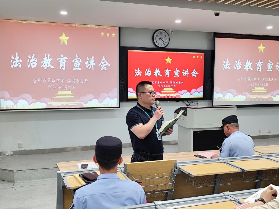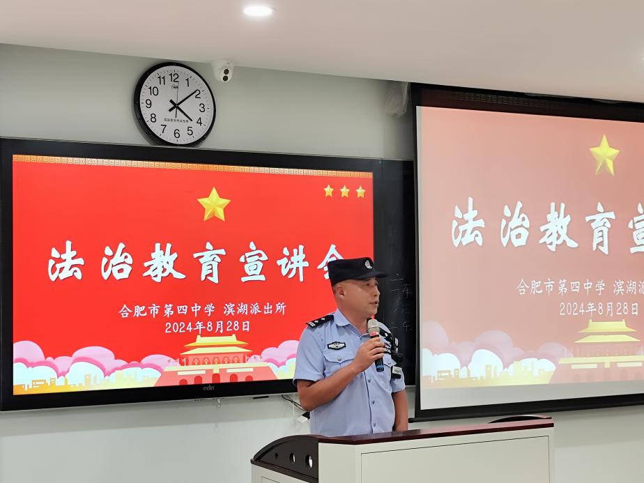 为了营造一个安全、和谐的校园环境,提高师生对校园欺凌的认知,共同建立校园防范与应对机制。2024年8月28日下午,合肥四中召开“预防校园欺凌”主题法治教育宣讲会,滨湖派出所民警、法治副校长桑亚南、分管安全副校长彭强、分管德育副校长赵勇、保卫科负责人李一凡及高三全体班级安全委员参与此次活动。