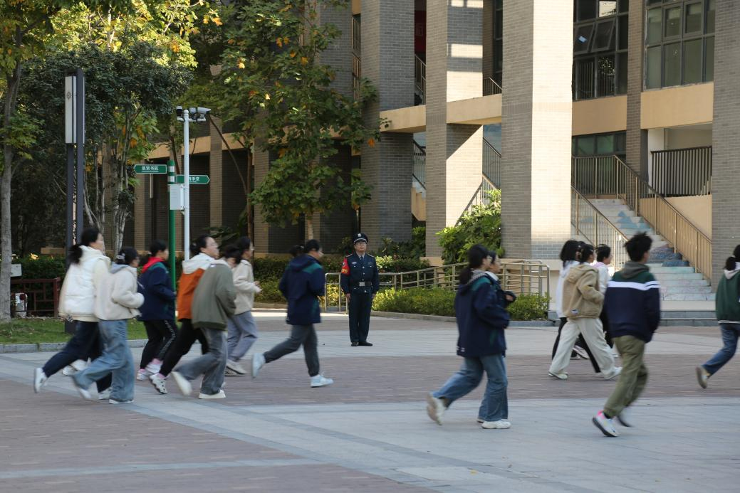 11月7日上午9:30,随着消防警报铃声响起,消防应急疏散演练正式开始,学生在老师的带领下迅速捂住口鼻,降低身体重心,迅速且有序沿着指定路线疏散撤离到运动场。