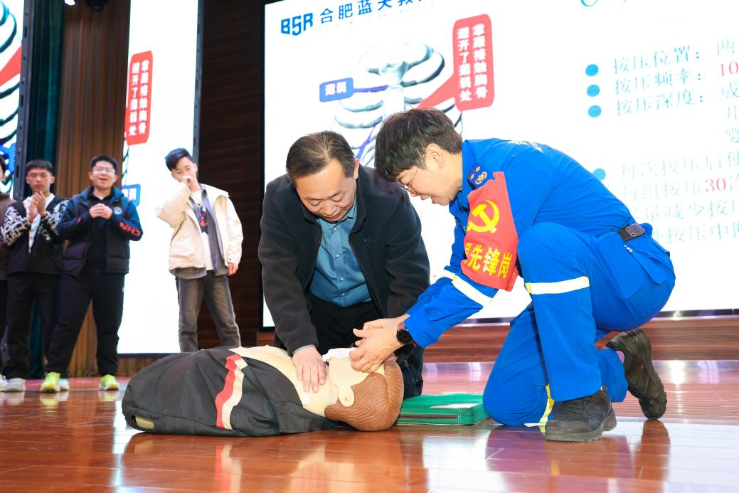 随后,蓝天救援队讲师马海宏通过“讲解-教学-演示-实操”四个环节,深入浅出地讲解了烫伤、鼻出血、癫痫、骨折等正确应对方法,演示了心肺复苏术、AED使用、海姆立克急救等技能,在互动环节,校长毛晓斌也亲自演示,带动老师、同学们纷纷上台体验。在大会讲解之后,生活老师、体育老师专门留下“开了小灶”。