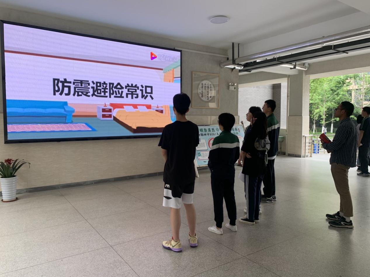 为使防灾减灾活动有序开展,取得实效,5月9日,保卫科推出了《防震避险常识》科普视频,在教学区、宿舍区循环播放,年级部组织在班会课和晚自习前安排学生集中观看学习,使师生充分认识到开展疏散演练活动的必要性。