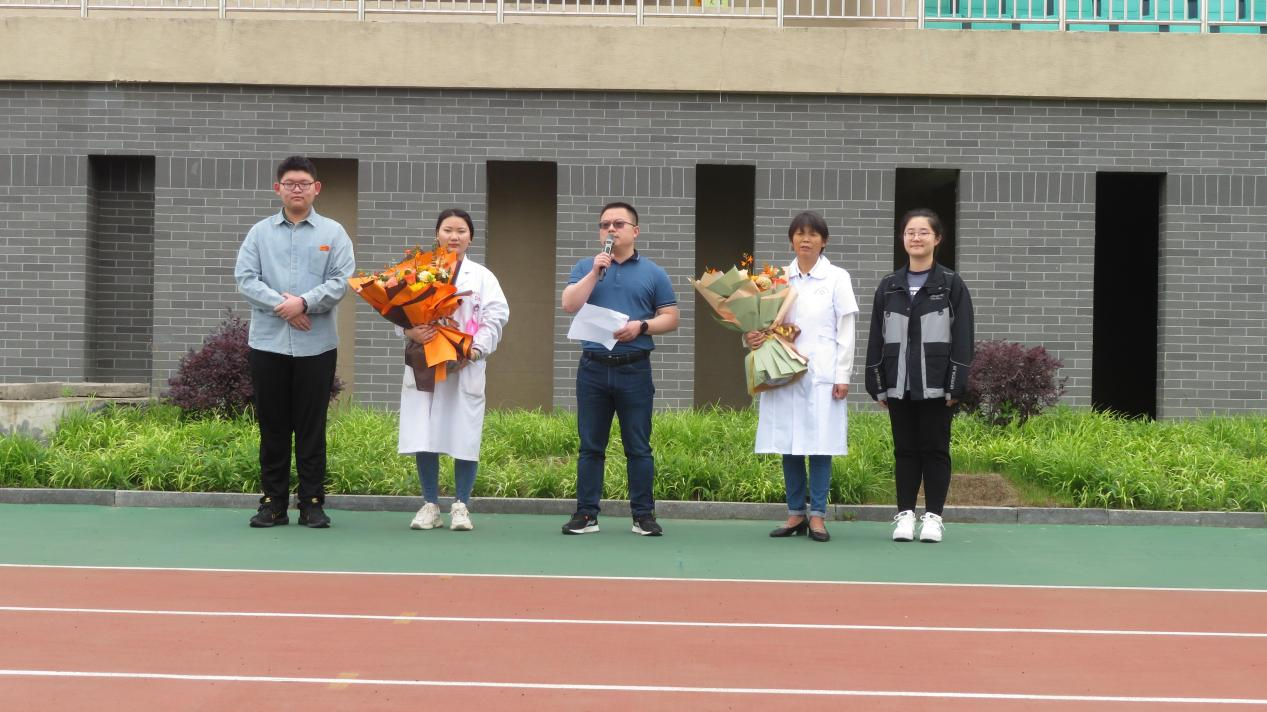 适逢“国际护士节”,演练之后,彭强副校长把两位校医请到队列前方,用一连串真实的数字向师生通报了恢复办学以来校医的突出贡献,倡议全体师生向生命健康的守护者致谢,高三两名同学代表全校师生向两位白衣天使献上鲜花,感谢她们两年多的陪伴与守护。