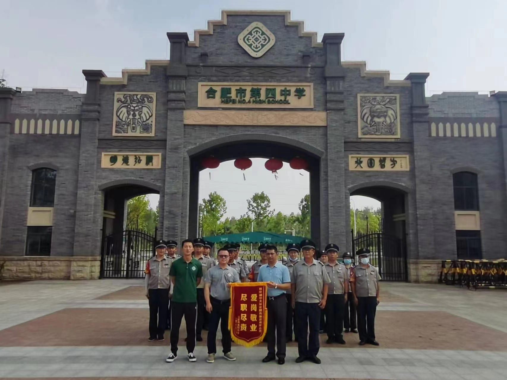 培训之后,合肥四中副校长彭强、滨湖派出所警官桑亚南分别对此次培训做出点评,表扬了保安不畏酷暑、勤学苦练的精神品质,也提出了提高思想认识、增强业务技能、保障校园平安的要求和期许。最后,彭强代表学校向保安公司赠送了锦旗,对中天保安公司进驻以来扎实有效的工作表示感谢。