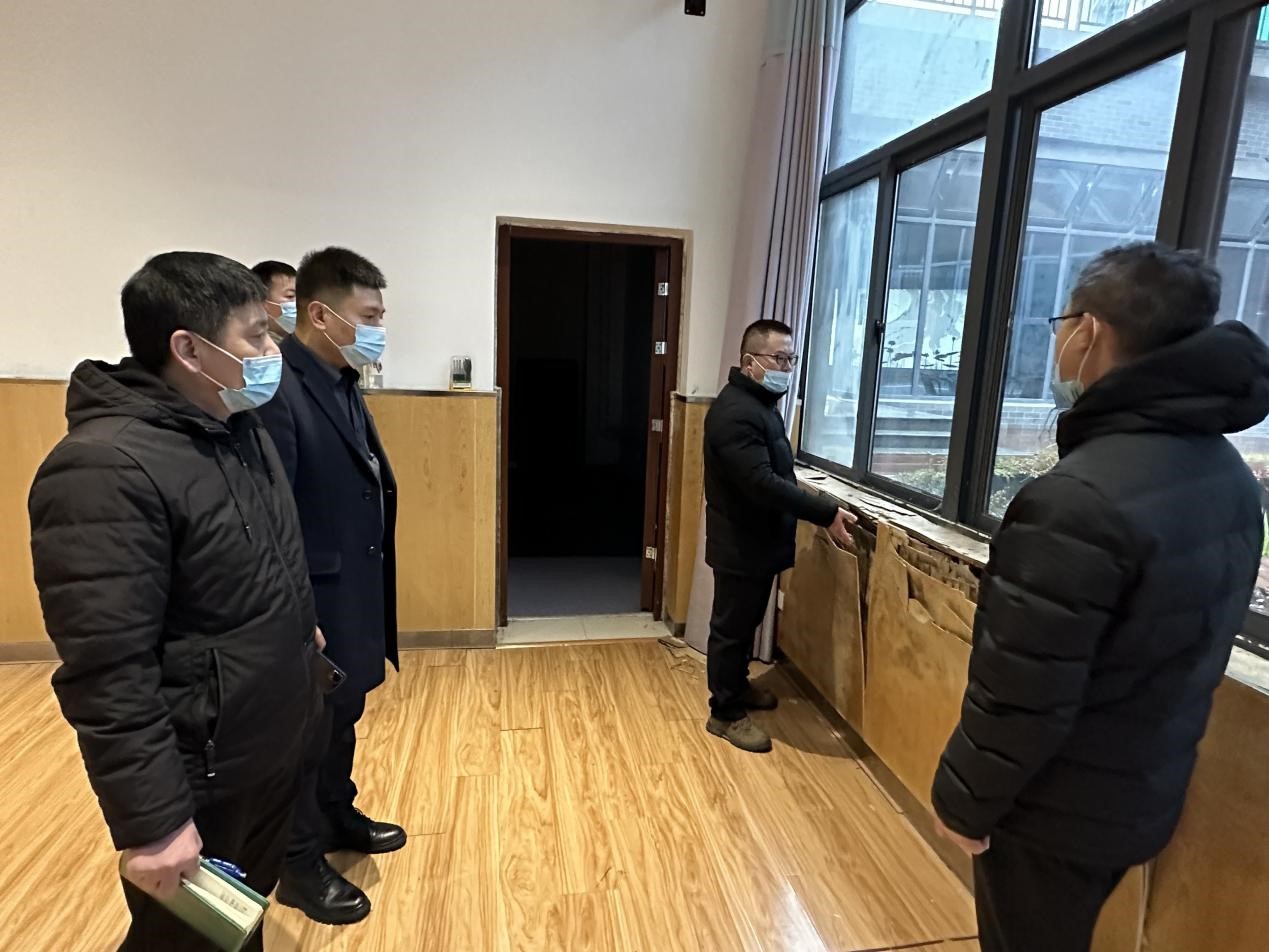 检查组按照全内容、无死角的工作思路,在教学区细致摸排教室、走廊、卫生间等部位门窗、栏杆、水电情况,统计存在破损的安全标识,全面检查了消防常闭门牢固性和窗户的限位情况;在地下车库,检查了水管渗漏、灰尘堆积、物品遗留、垃圾堆放等情况;在艺术楼,检查了各功能室和社团活动室的安全卫生状况;在食堂,检查了清洁消毒、索证索票、库房库存等情况;最后,在新建男生宿舍楼工地,详细查看了屋面防水层浇筑、门窗框安装、水电施工现场,询问了施工安全措施落实情况,提醒现场管理人员关注天气变化,落实雨雪天气防滑防冻措施。