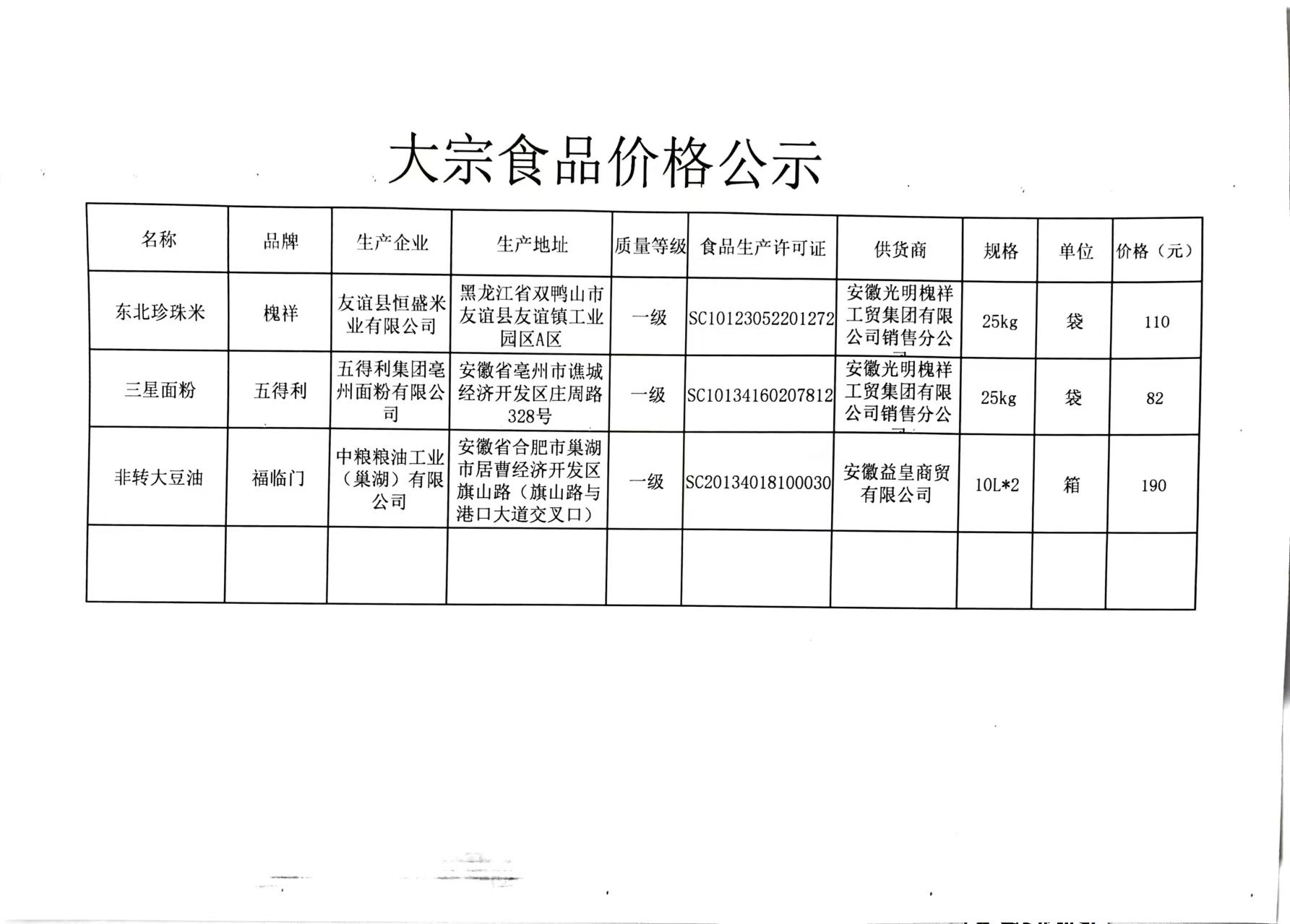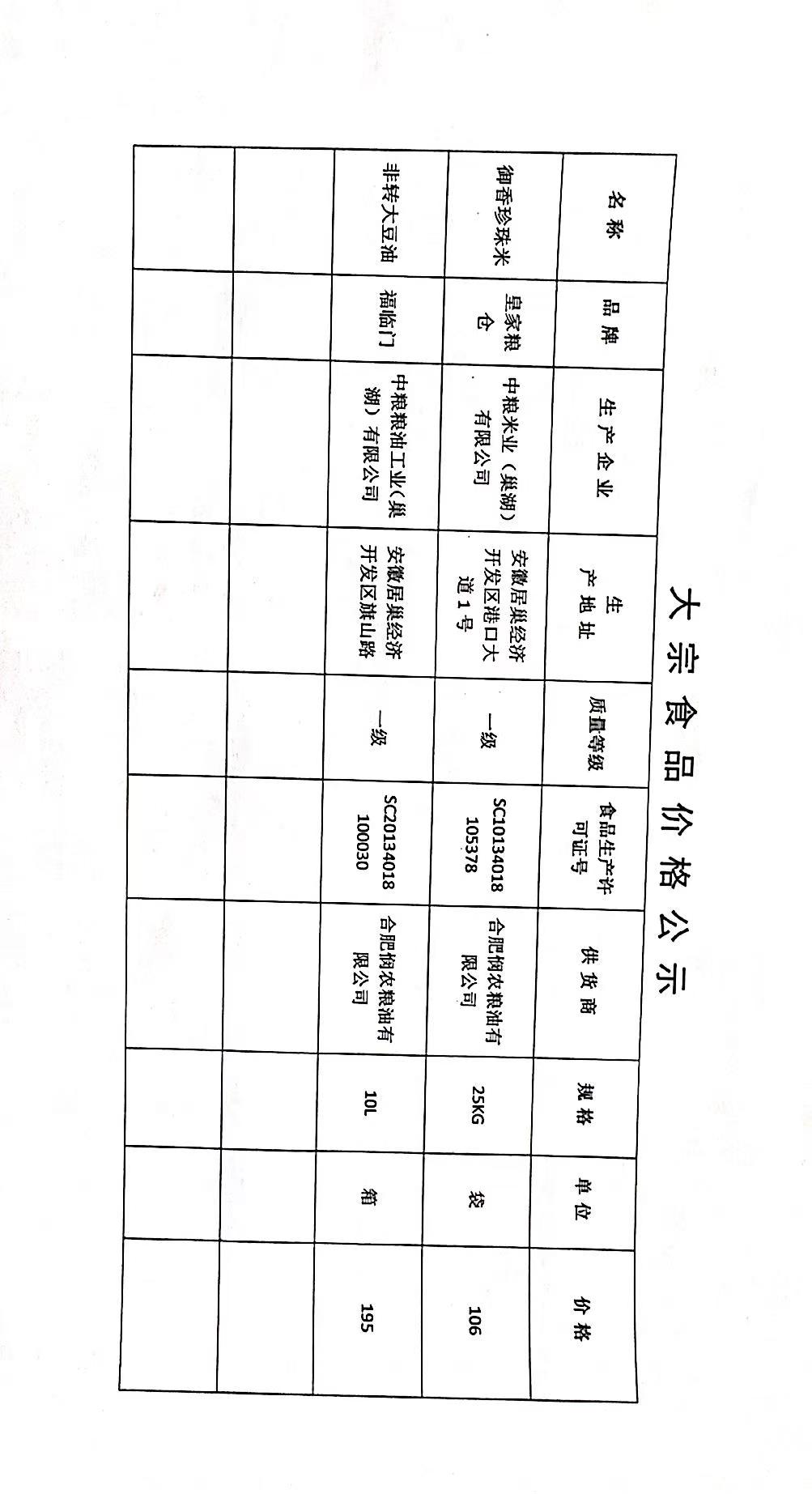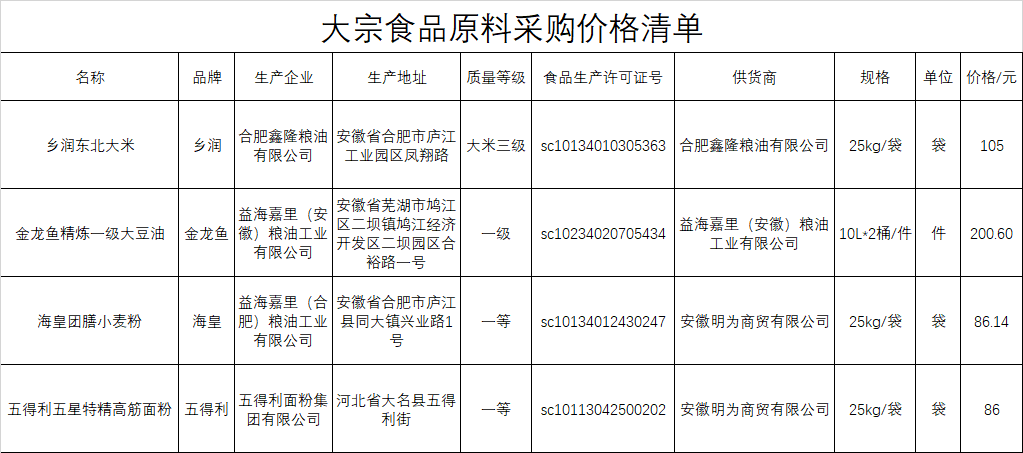合肥四中四季堂大宗食品采购价格公示