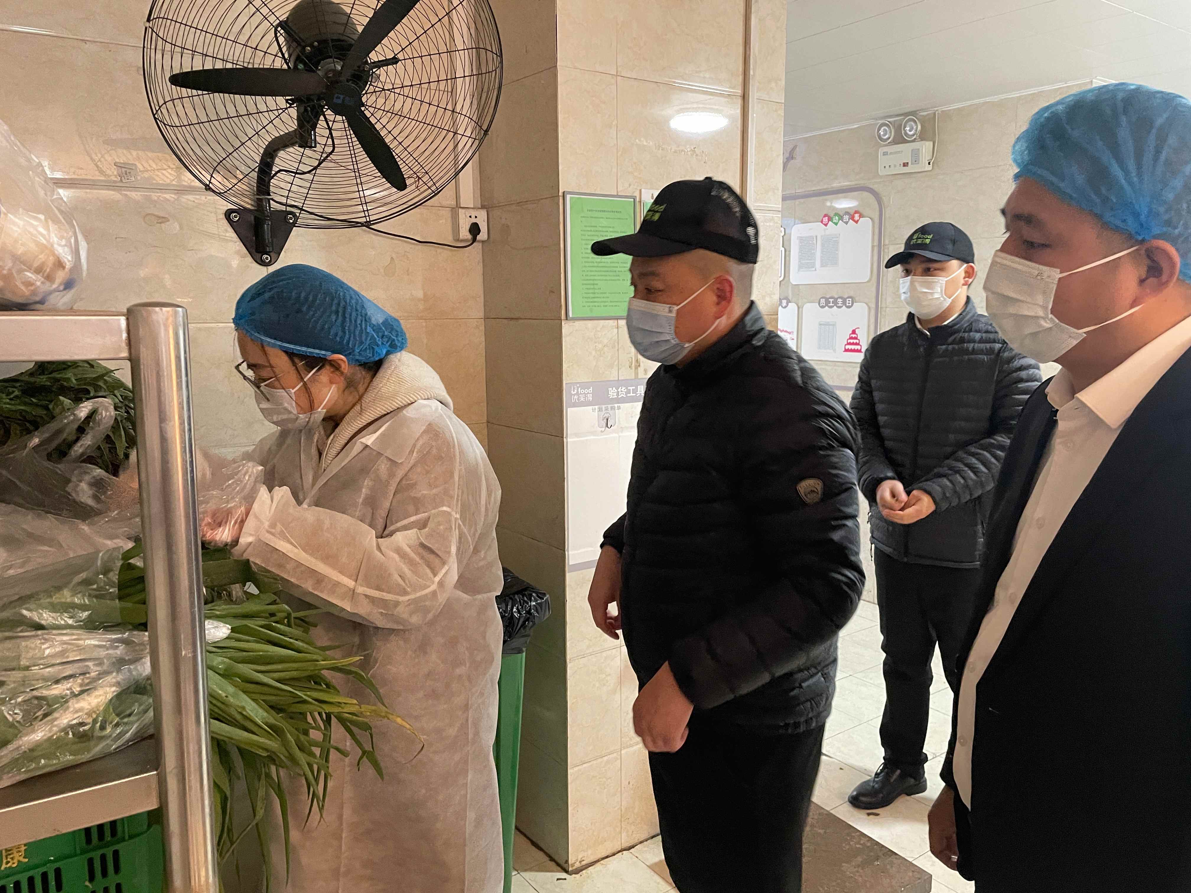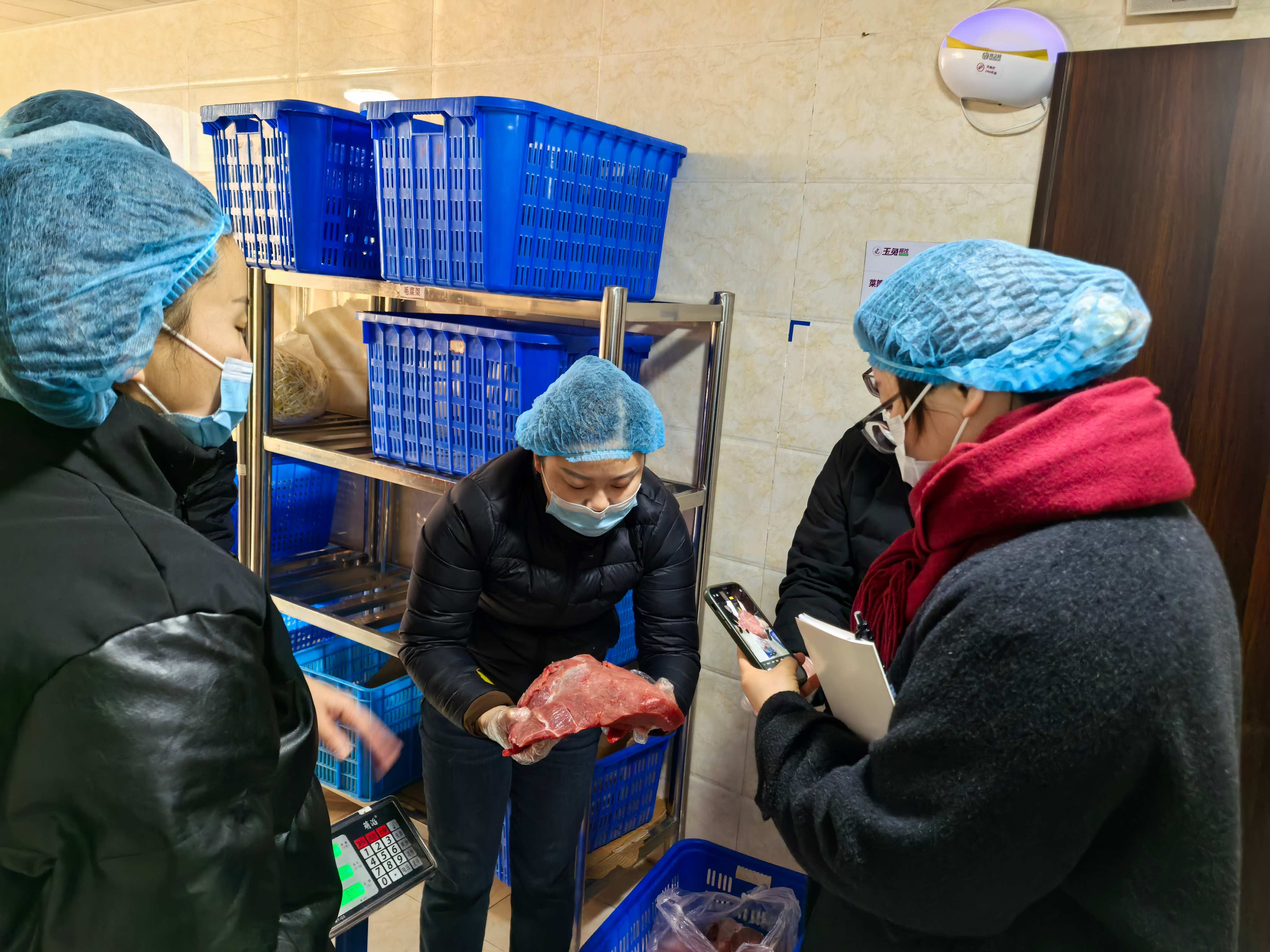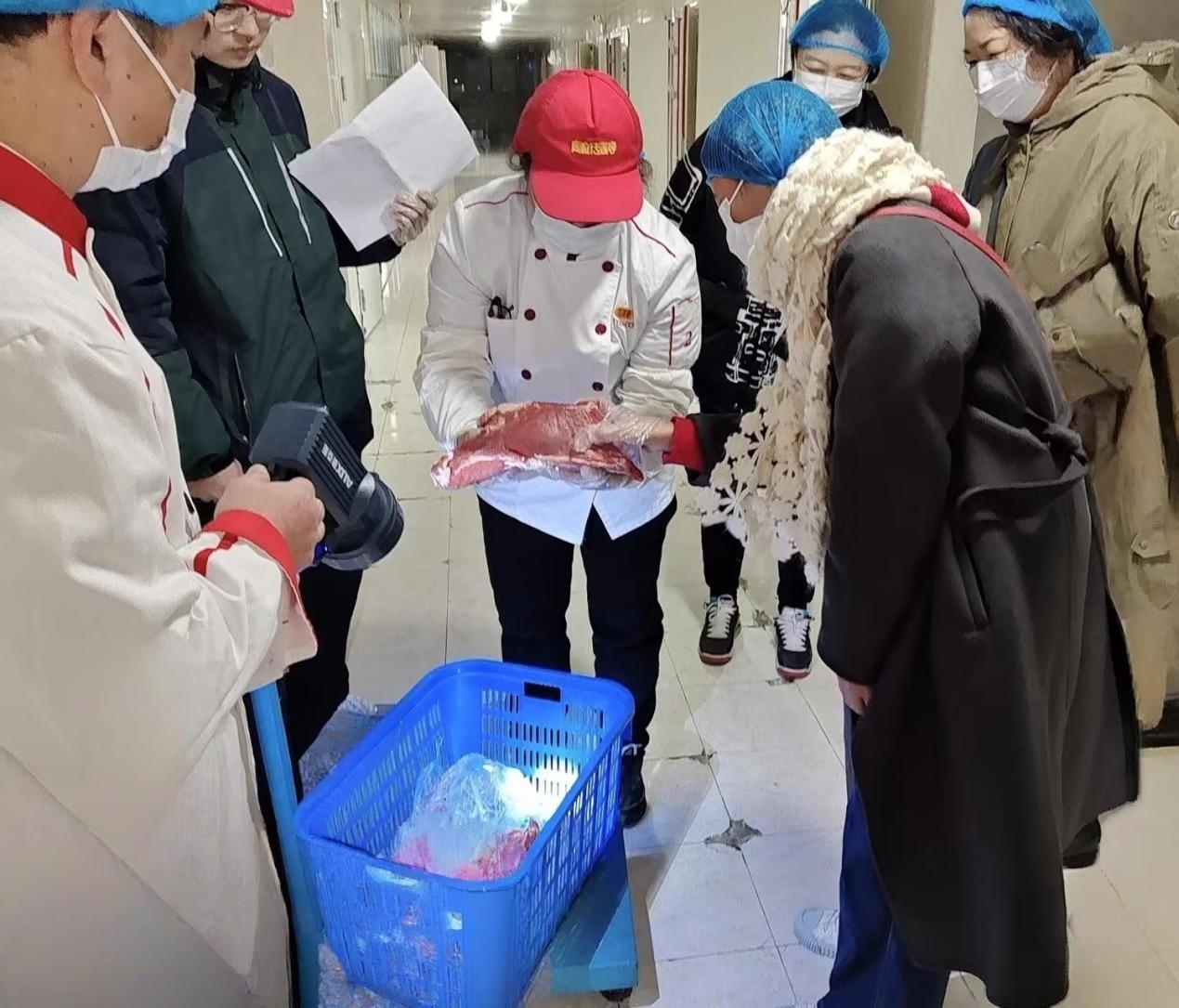 本次会议确定主题为“食材验收”和意见征集。早上8时许,与会人员在一楼餐厅集合,彭强首先对膳委会的职能和会议安排做了说明。随后,与会人员分为三组,分别前往食堂三个楼层的验货区,采取“望闻问切”、对账称重的方法,全程参与食材进货查验。