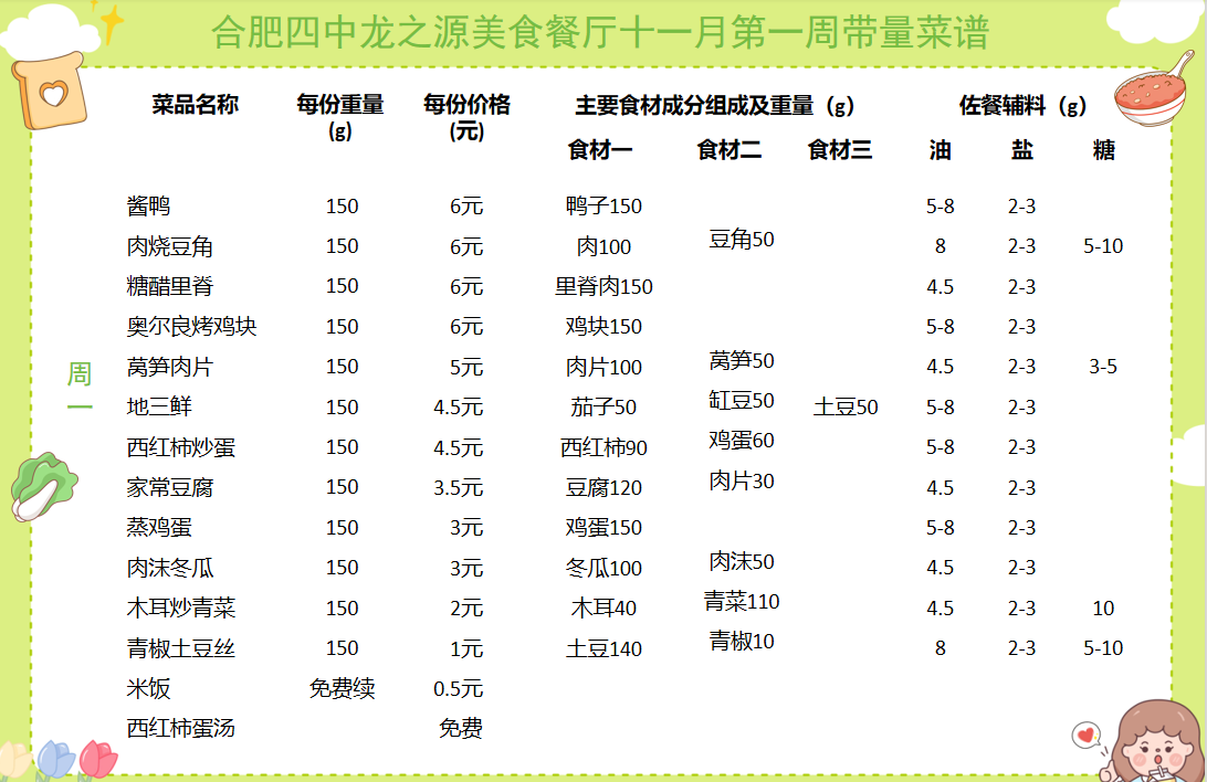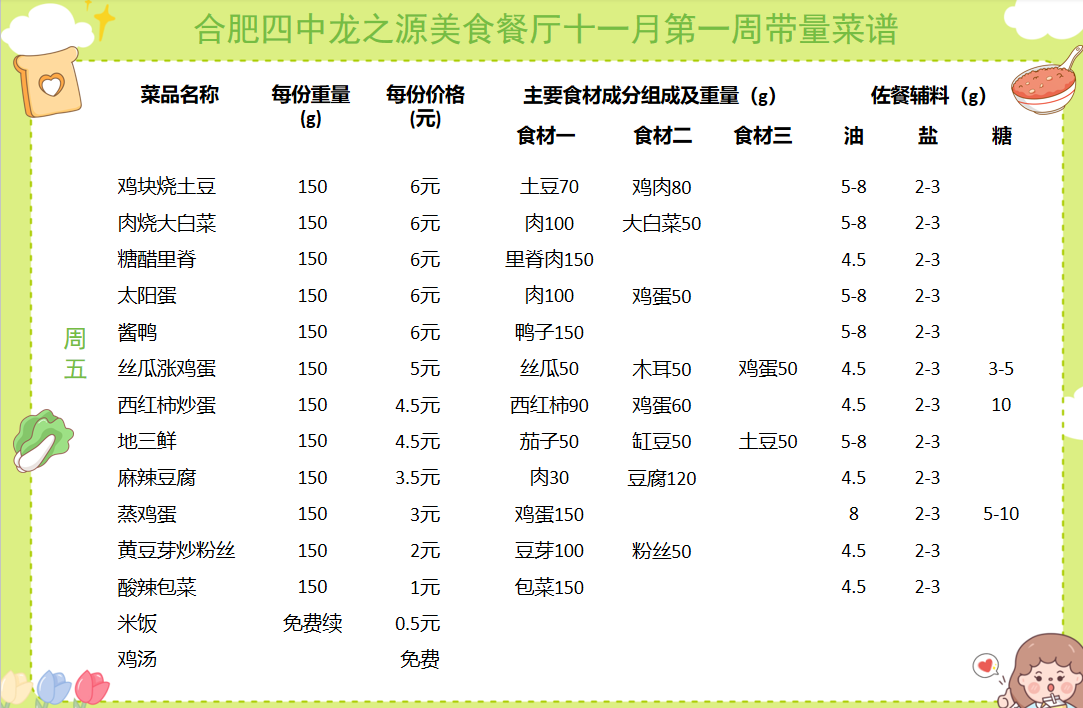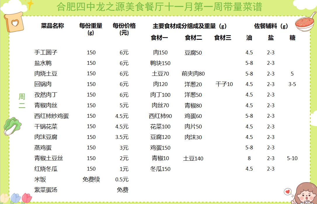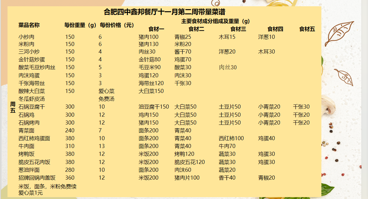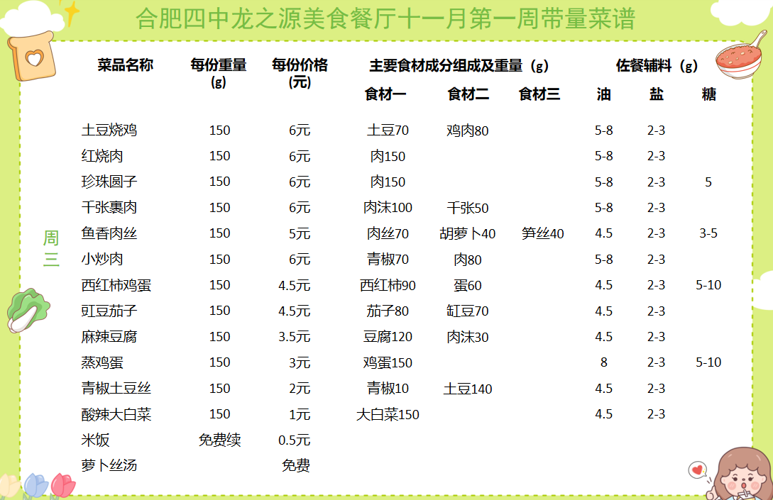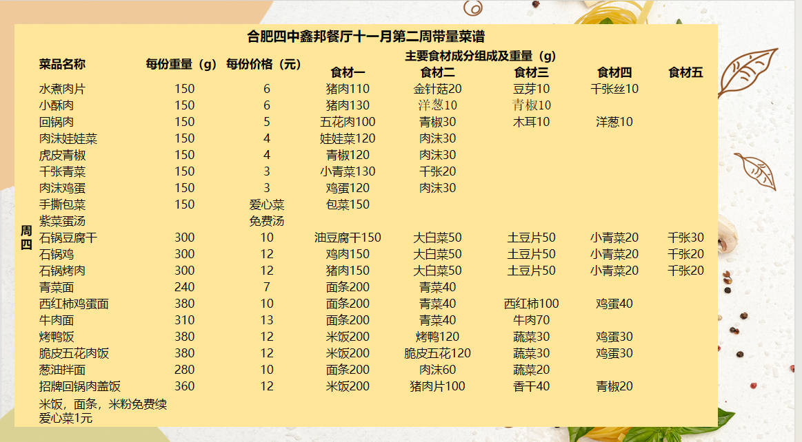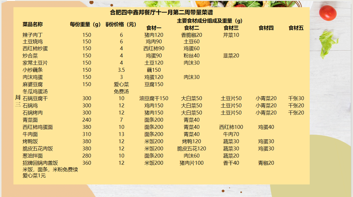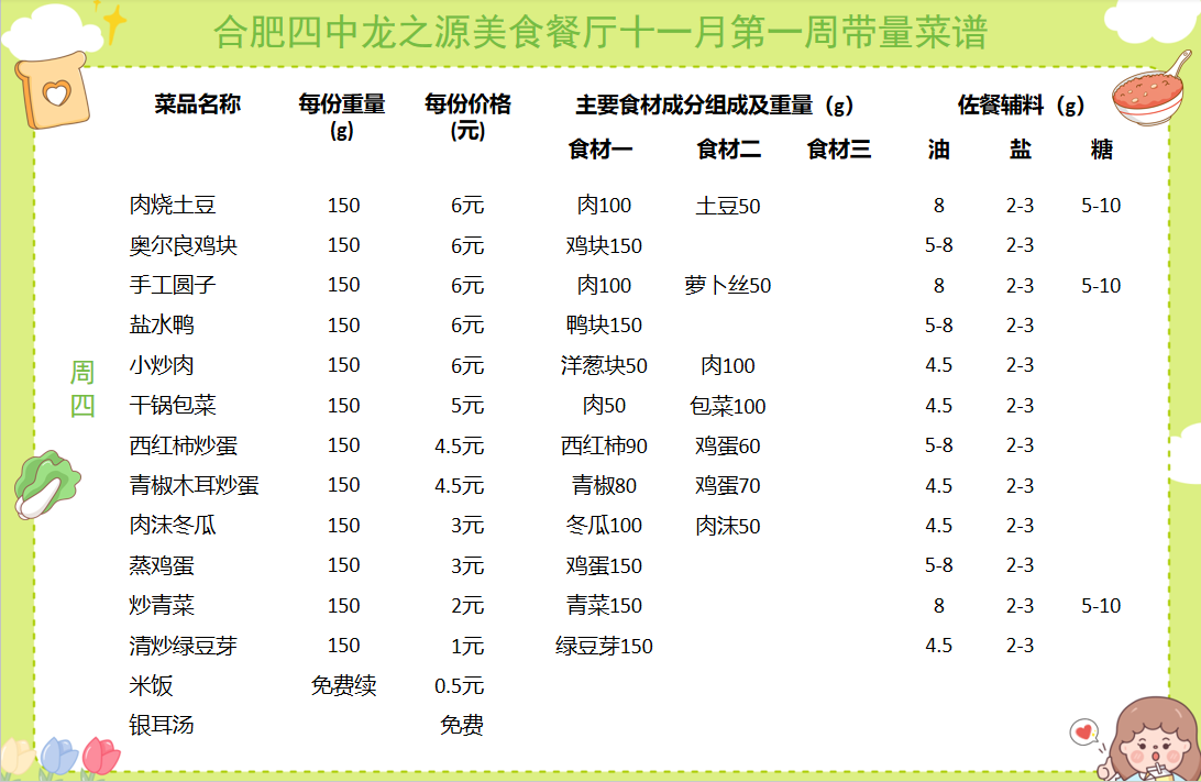 合肥四中四季堂2025年11月10日——11月14日一周食谱