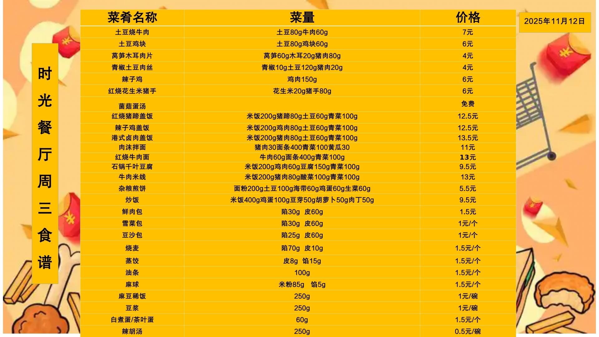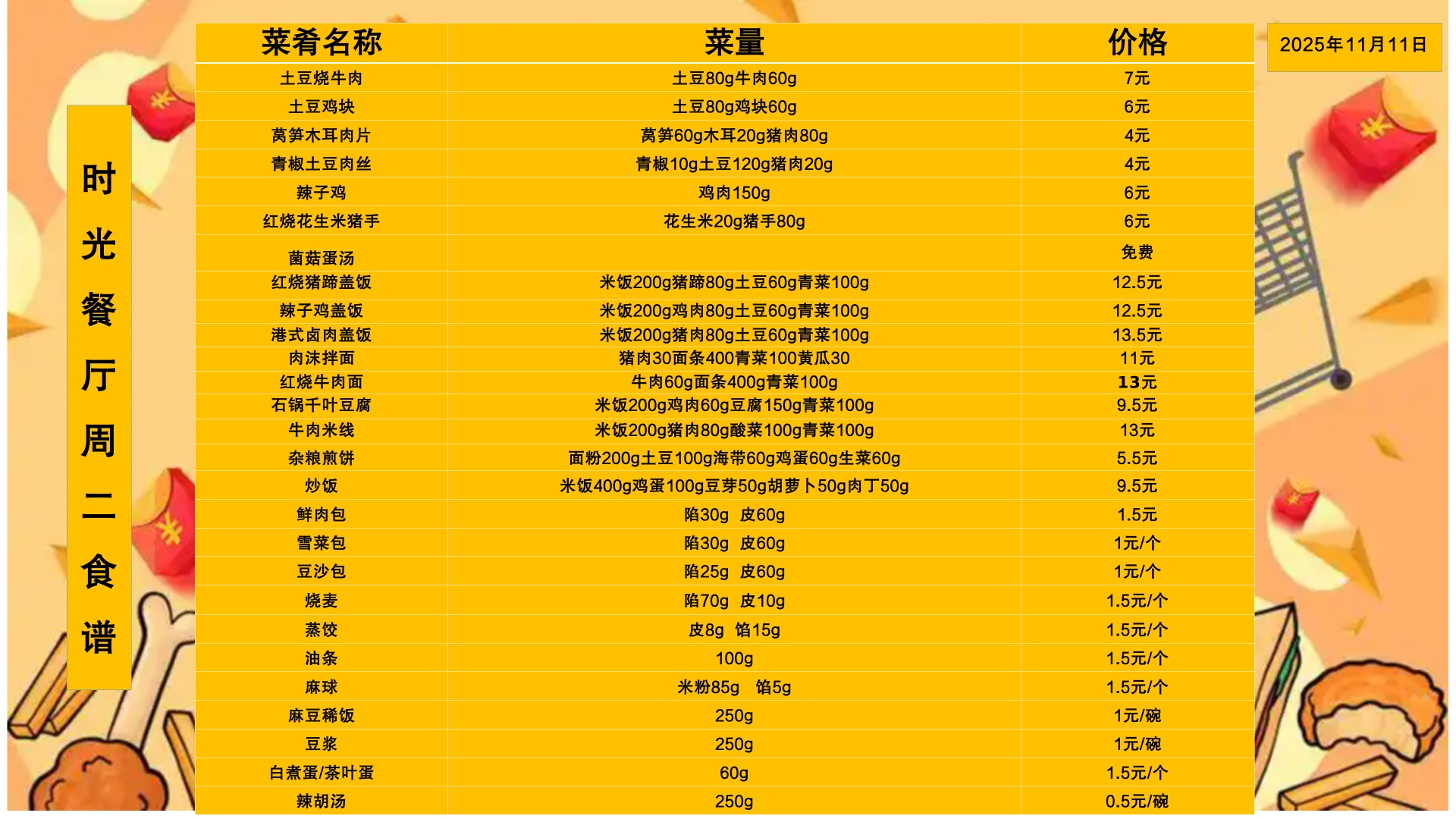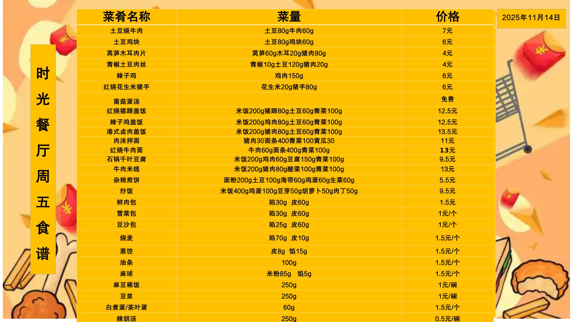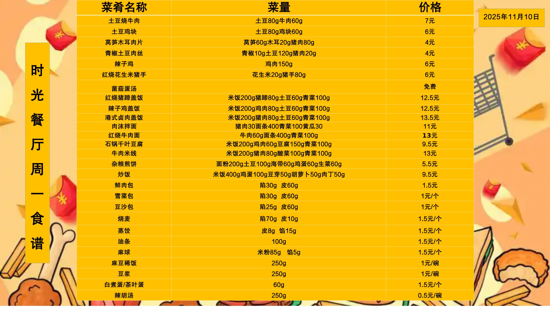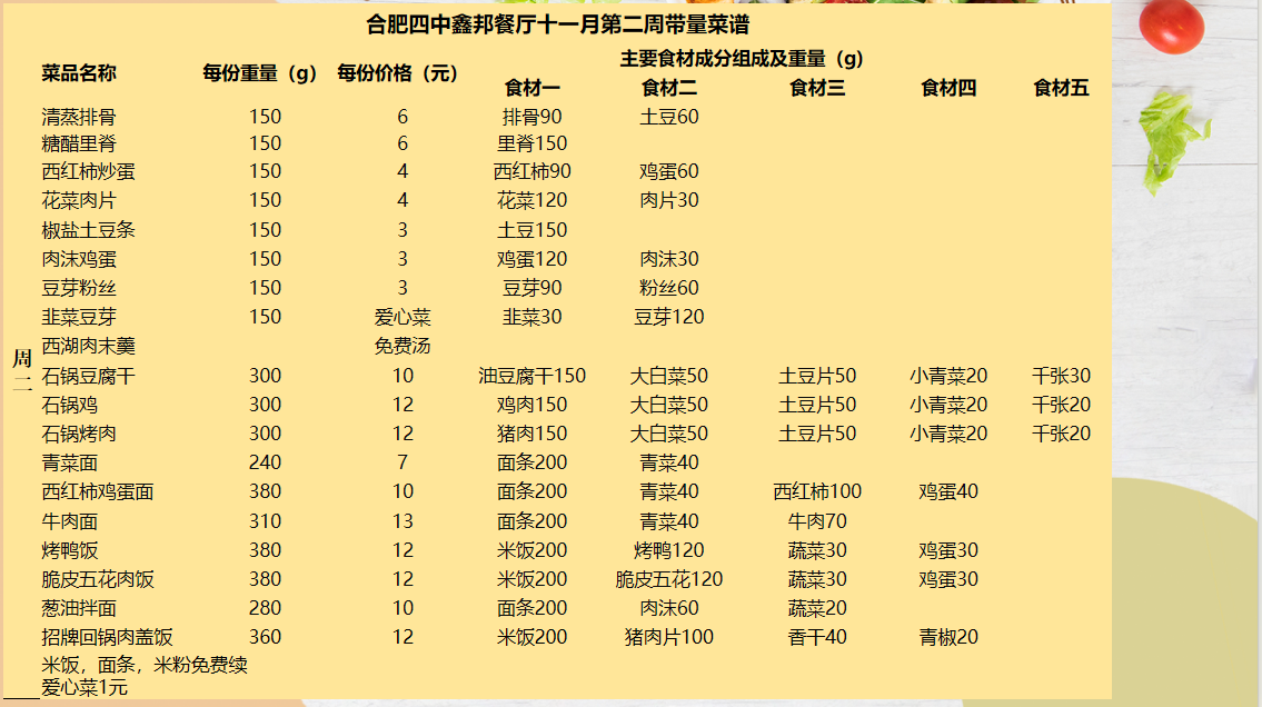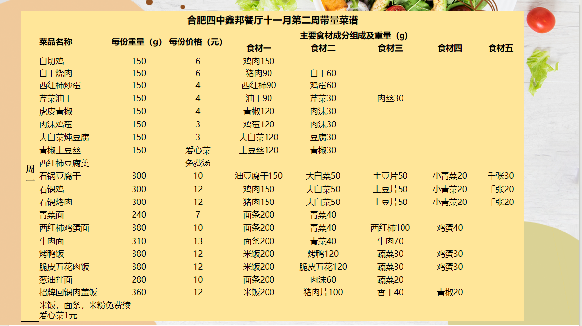 合肥四中四季堂2025年11月10日——11月14日一周食谱