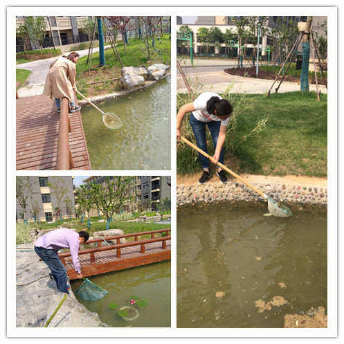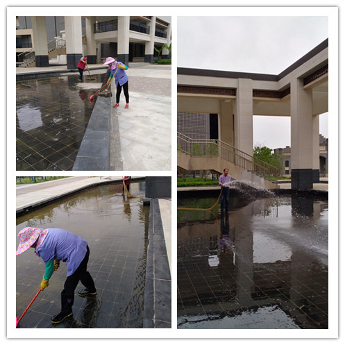 其次,除常规的保洁工作外,四中物业部门还积极完成学校总务处交代的其他工作如:清理和打捞教师公寓南面池塘里的蓝藻、清理图书馆2层,3层和图书馆公共平台卫生、为中和会堂南面草坪上的保加利亚玫瑰修剪、施肥、浇水、杀虫、清理礼堂西边水池污水等等。