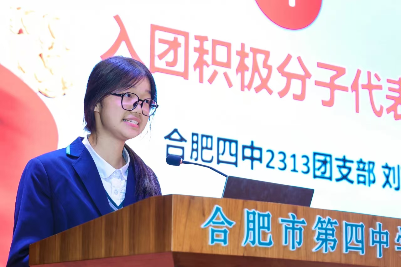 之后,合肥四中高二年级2313班刘可欣同学作为入团积极分子代表进行发言。刘可欣指出,作为一名入团积极分子,我们感到无上光荣,要充分认识到共青团员的责任和义务,严格按照共青团员的标准要求自己,认真学习,在班级团支部里起到模范带头作用。