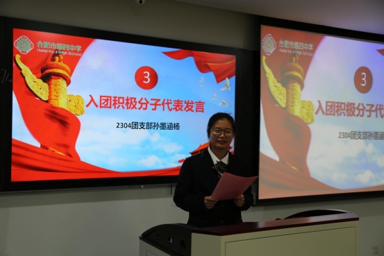 仪式第三项,合肥四中2023级入团积极分子代表2304孙墨涵杨同学发言,她指出,入团不仅是一份荣誉,更是责任、担当和使命。回顾团史的百年征程,共青团坚持党的领导,理想信念,扎根广大青年,组织引导一代又一代青年坚定信念,紧跟党走,发挥了重要的作用。