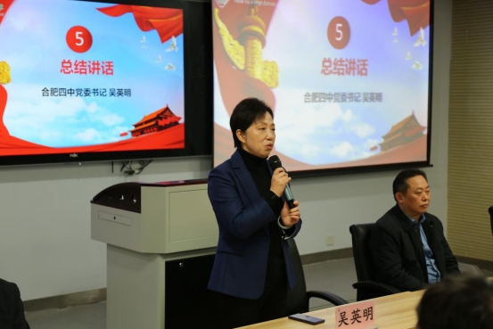 仪式第五项,合肥四中党委书记吴英明总结指导讲话。首先要坚定理想信念之魂,把握青春奋斗的正确航向;第二,要发挥先锋模范作用,筑牢青春奋斗的组织堡垒;第三,要夯实成长成才之基,展现青春奋斗的魅力风采。吴书记希望大家让优秀成为一种习惯,在经风雨、长才干中焕发四中青年的蓬勃朝气,在组织上更在思想上入团,让景贤、成贤、聚贤蔚然成风,让成长成才成为四中最靓丽的一道风景!
