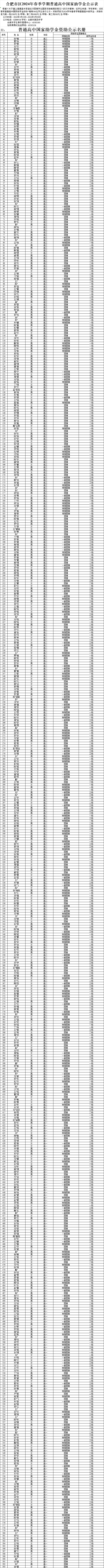 合肥市第四中学2024年春季学期国家助学金名单公示