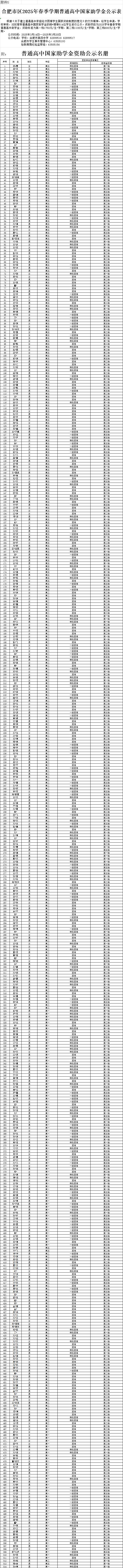 合肥市第四中学2025年春季学期国家助学金名单公示