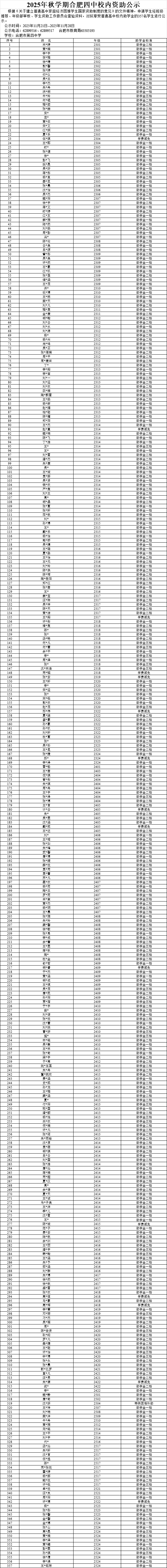合肥市第四中学2025年秋季学期校内助学金名单公示