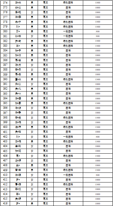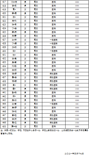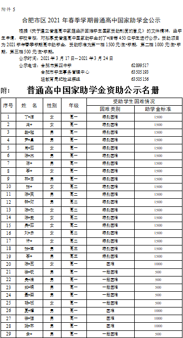 合肥市第四中学2021年春季学期国家助学金名单公示