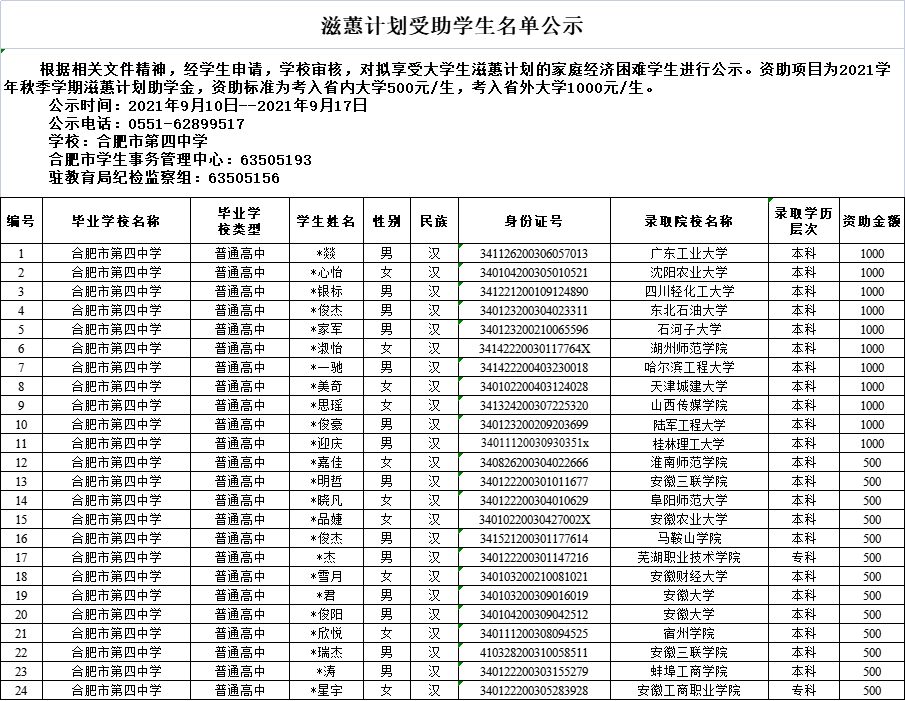 合肥市第四中学2021年滋中央蕙计划助学金名单公示