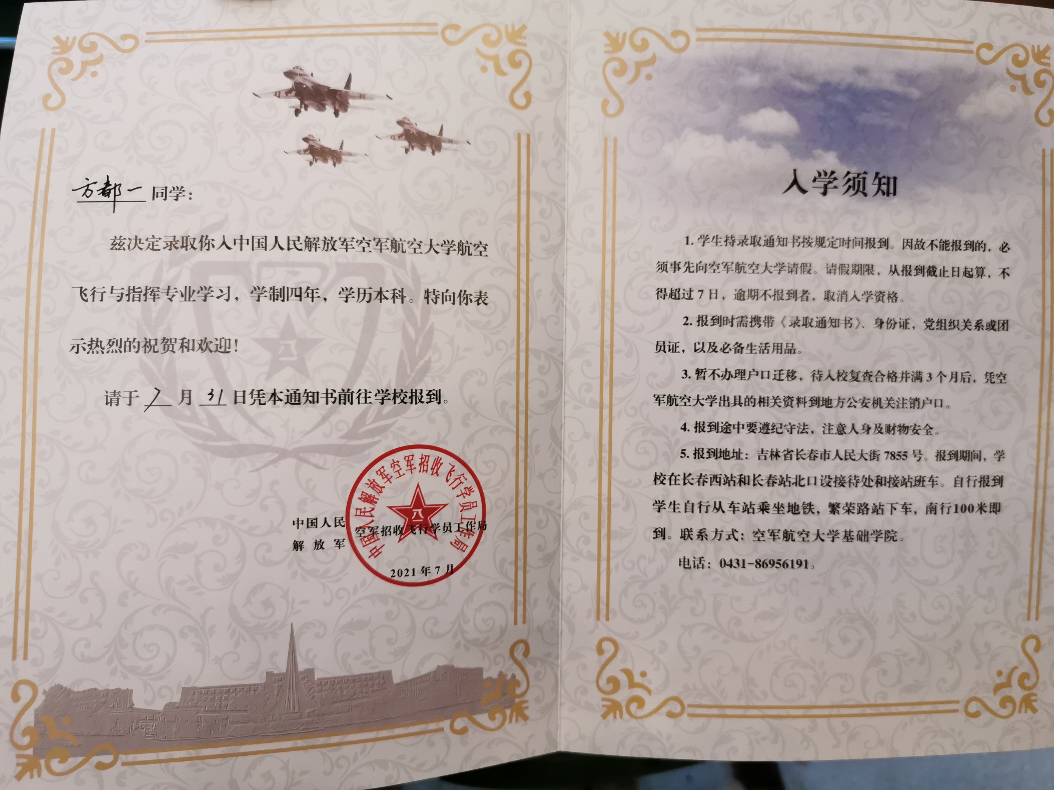 空军是战略性军种,是国家安全和军事战略全局中具有举足轻重的地位和作用。习近平总书记指出,建设空天一体、攻防兼备的强大人民空军,是时代赋予空军的重大使命。在接到空军招飞通知时,学校高度重视,积极宣传与动员,多名同学报名,经过多次体检,再经过高考和政审等环节,1811班方都一同学脱颖而出,被中国人民解放军空军航空大学录取。