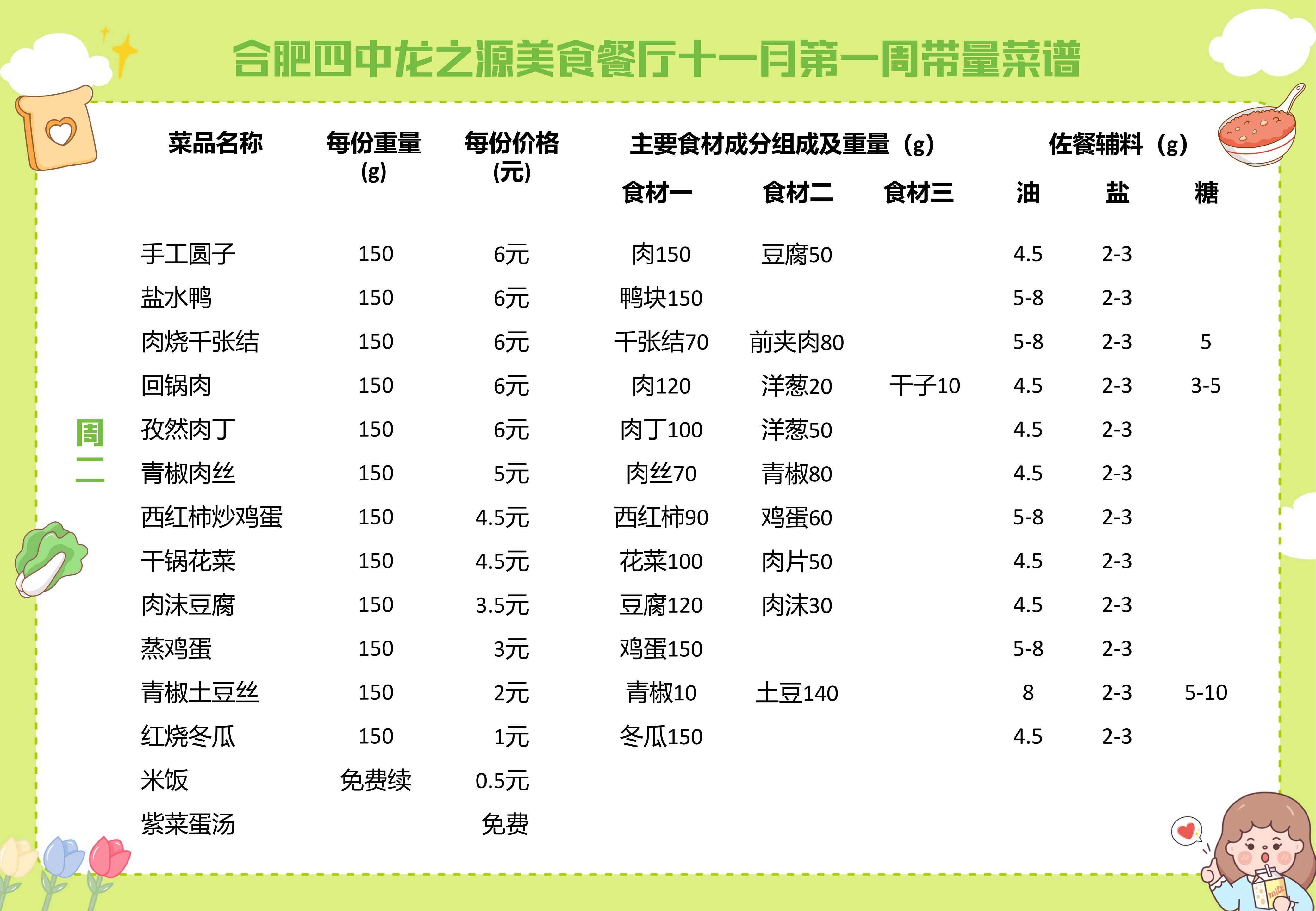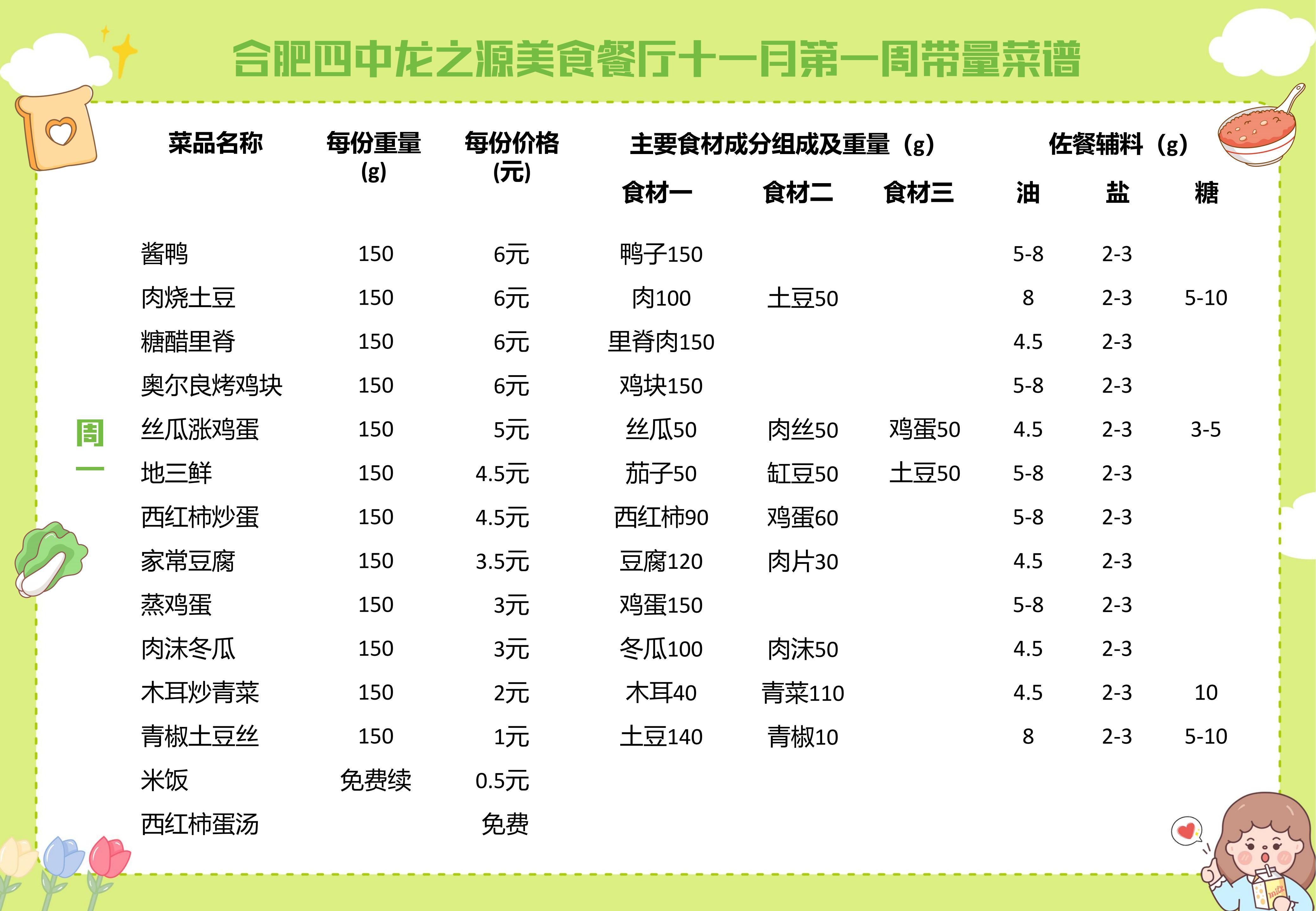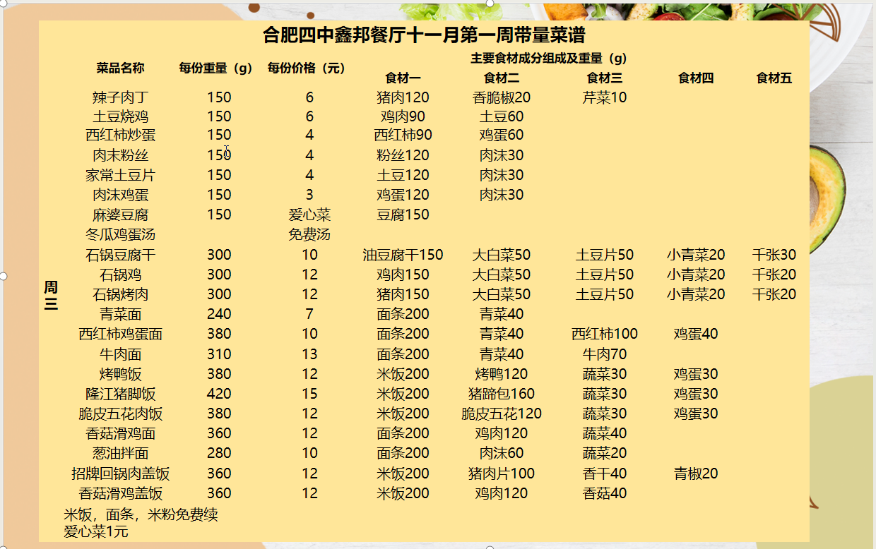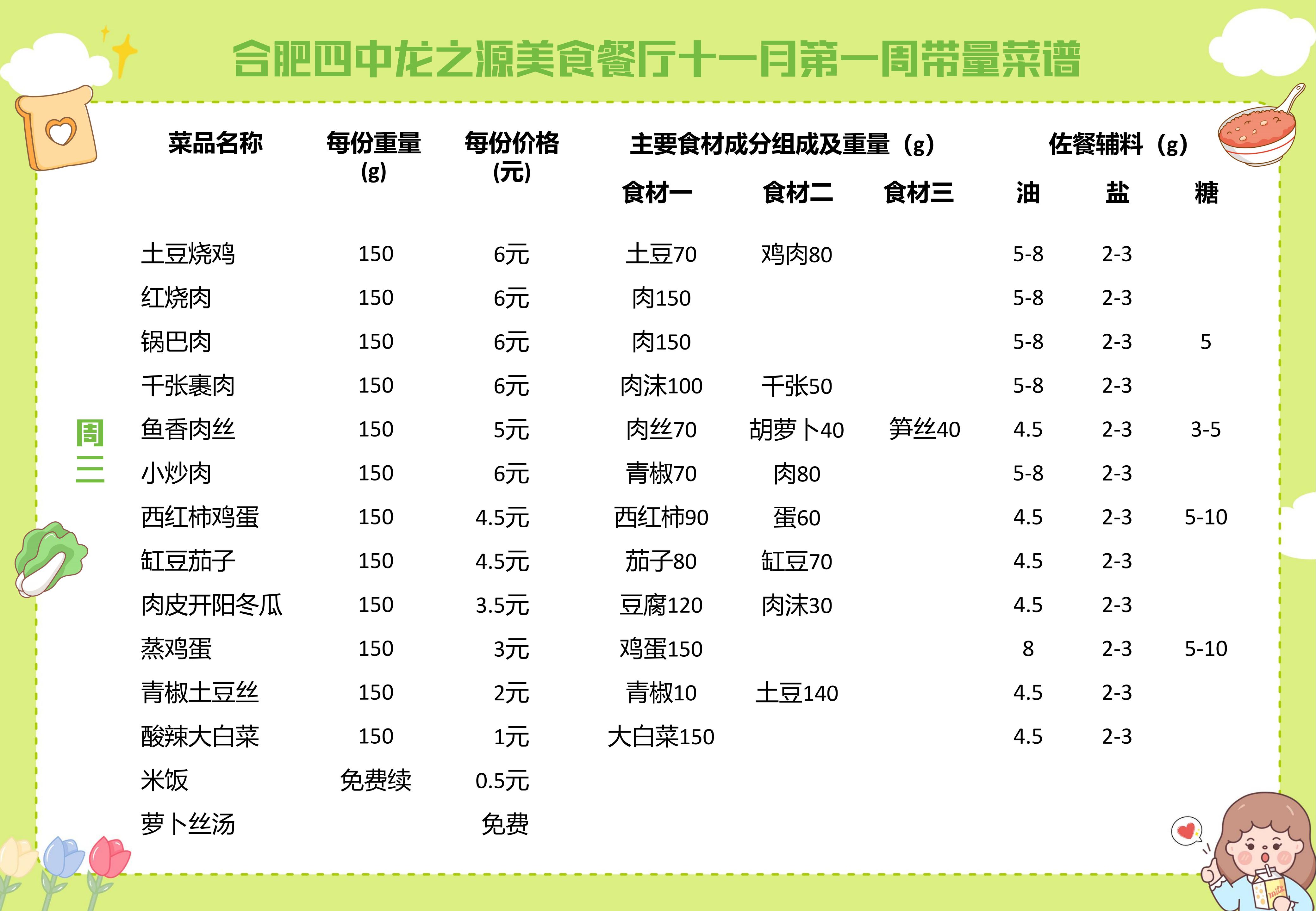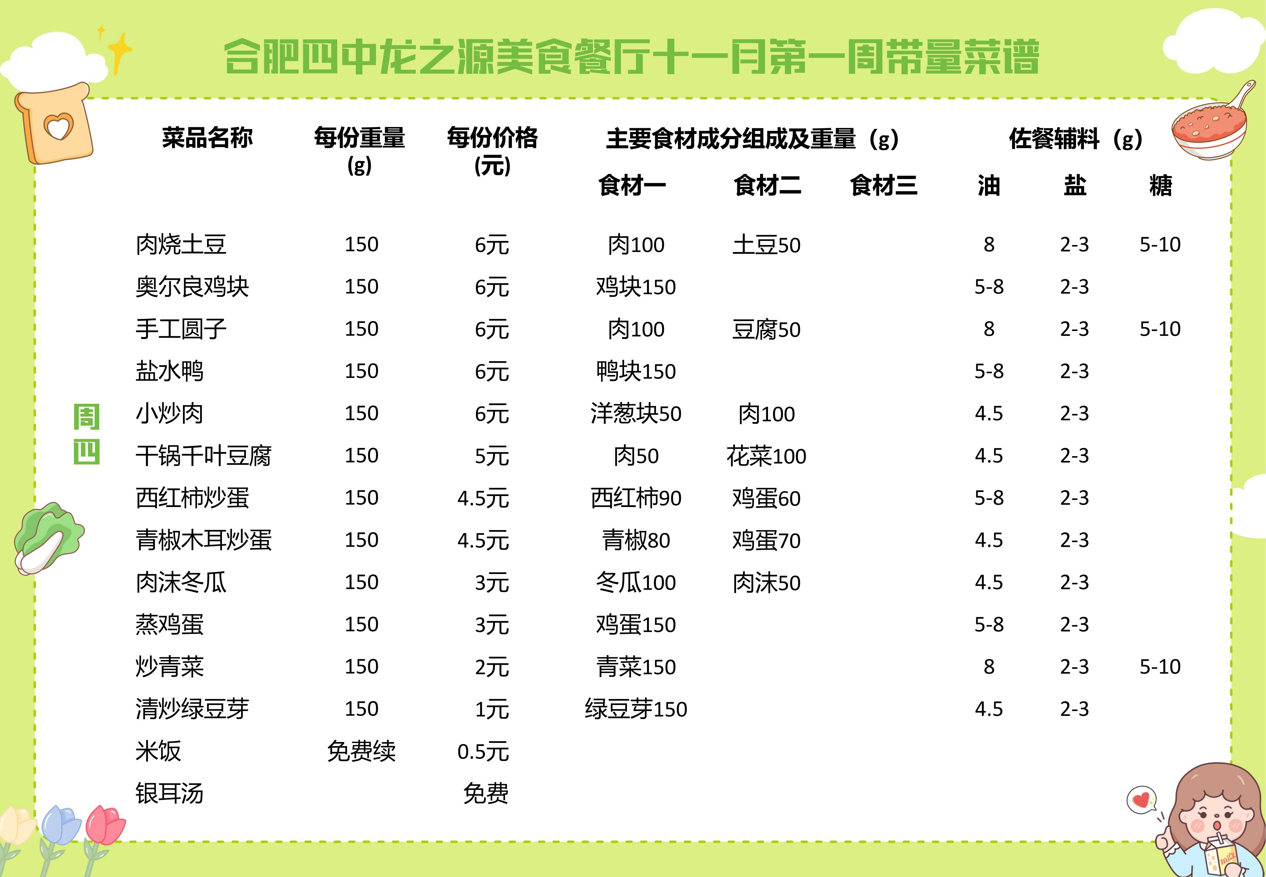 合肥四中四季堂2025年11月3日——11月7日一周食谱