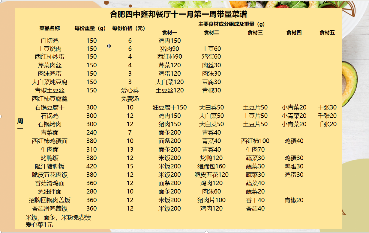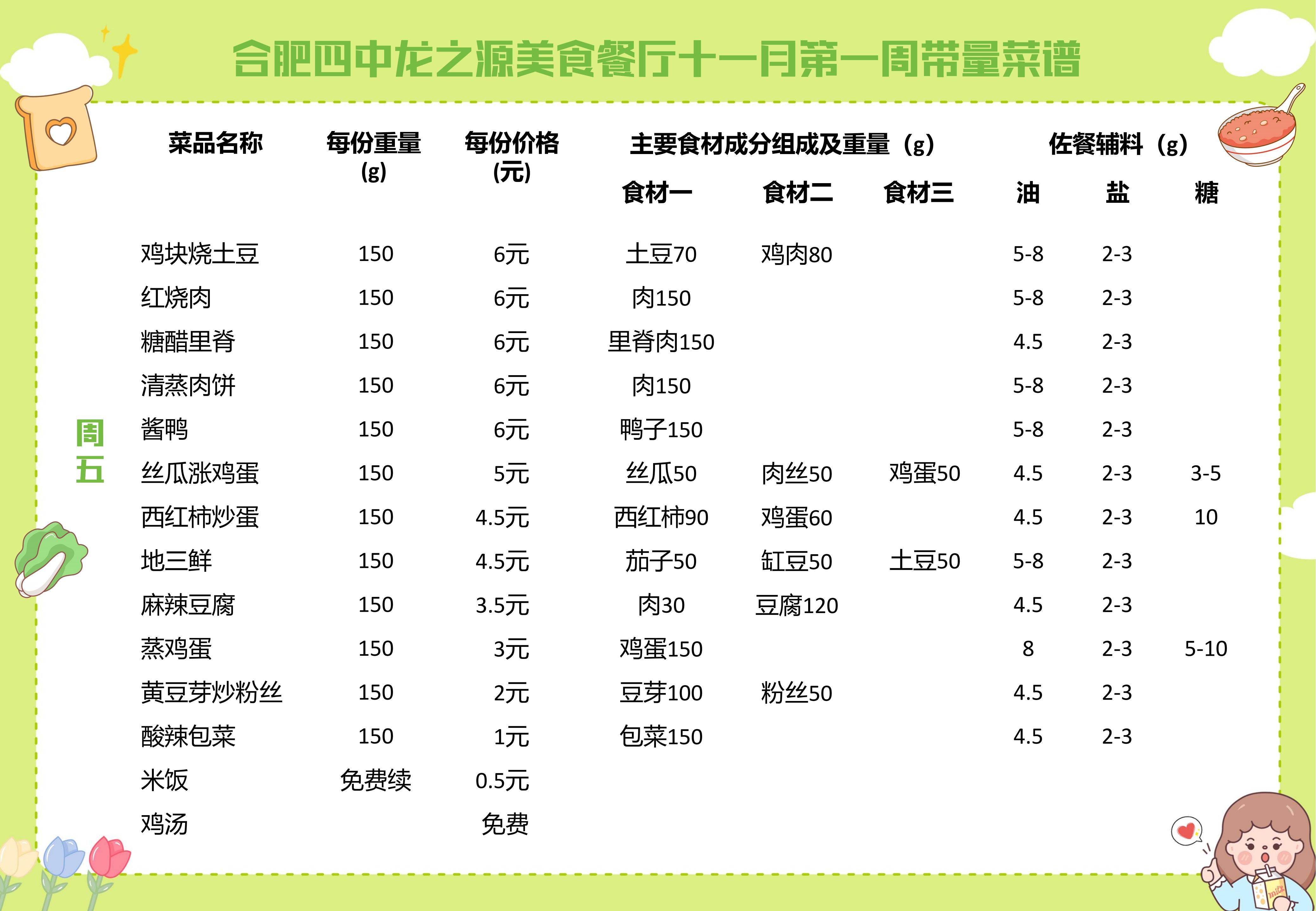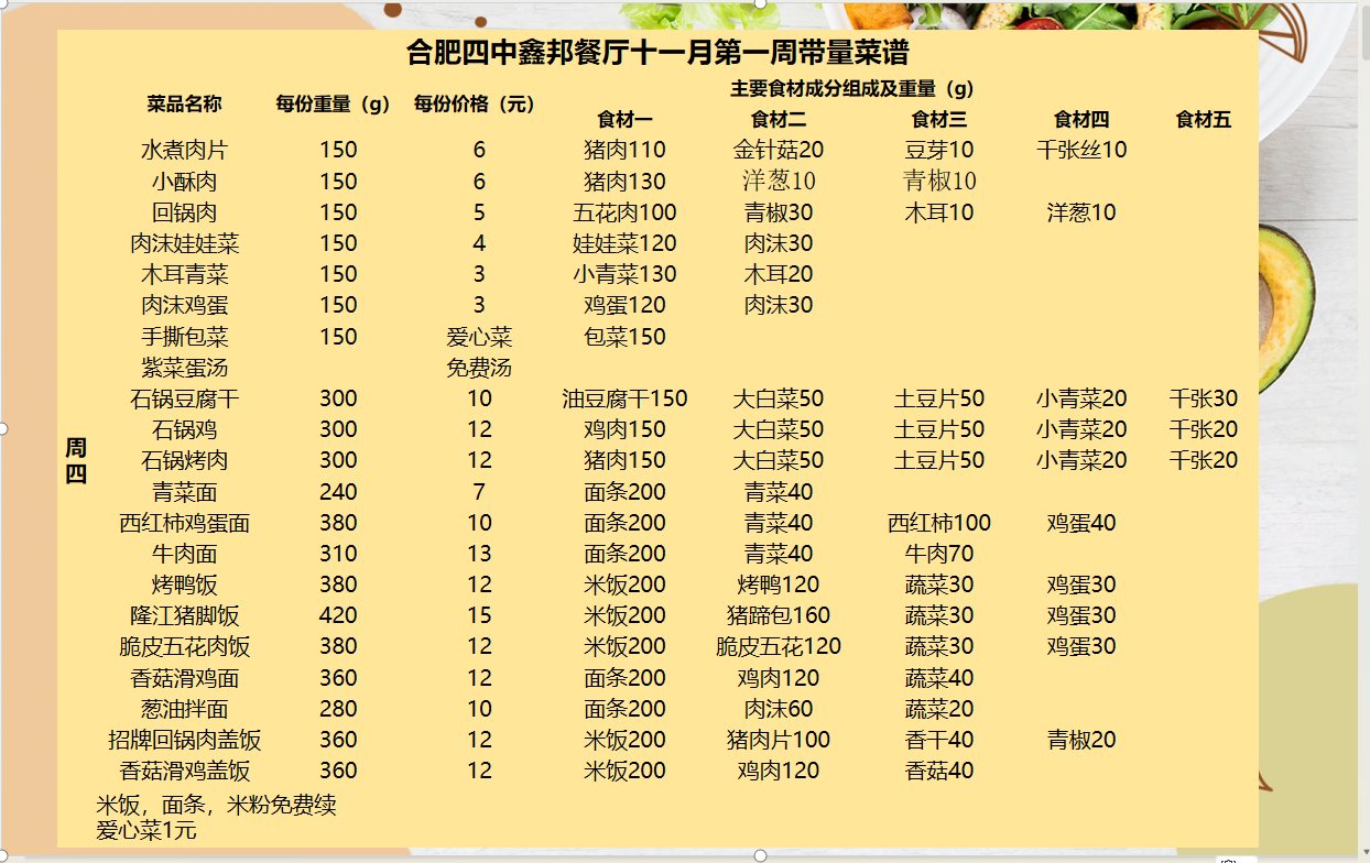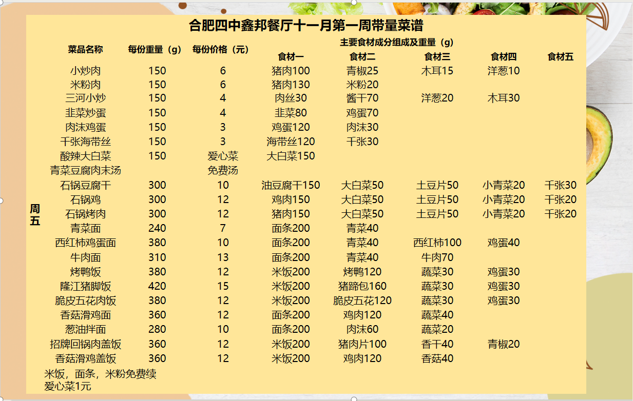 合肥四中四季堂2025年11月3日——11月7日一周食谱