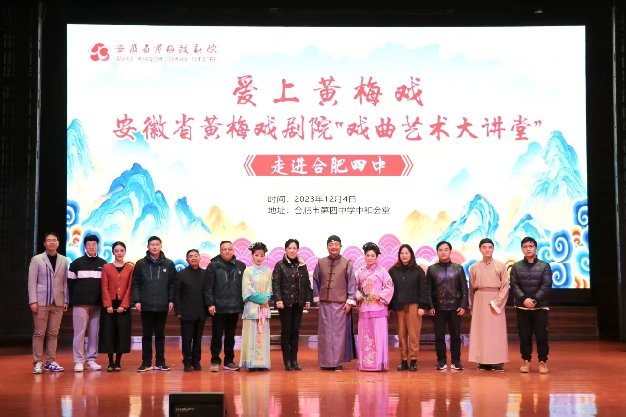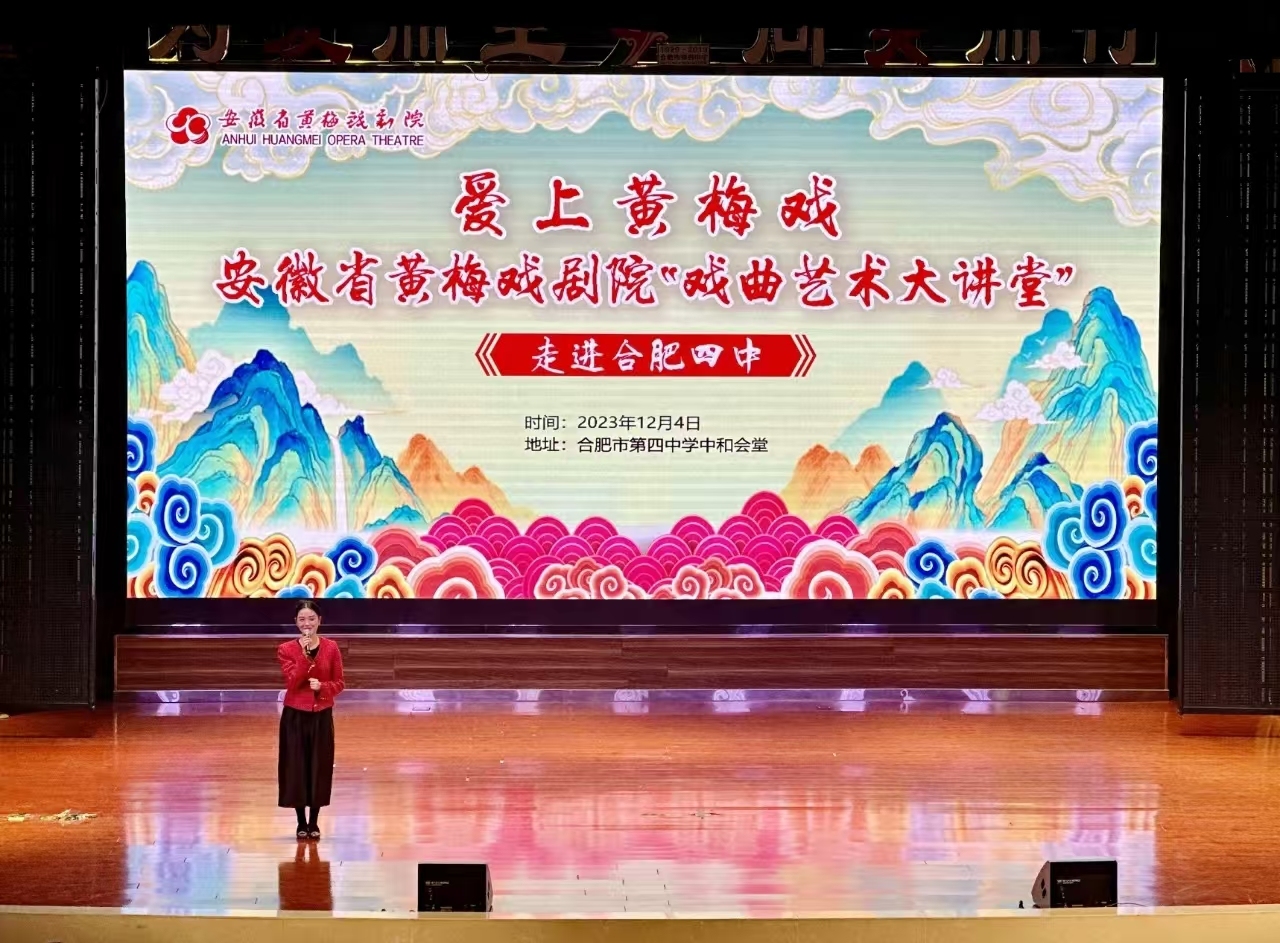 2023年12月4日下午,安徽省黄梅戏剧院“戏曲艺术大讲堂”在合肥市第四中学中和会堂隆重举行,此次活动由安徽省黄梅戏剧院主办,合肥市第四中学承办。安徽省黄梅戏剧院党总支书记范伟、副院长王成,合肥四中党委书记、校长吴英明,副校长李昌年、赵勇,庐江二中副校长宋丰明,高一年级部主任蒋浩,副主任何飞以及六百余名四中学子及戏曲爱好者参加活动。