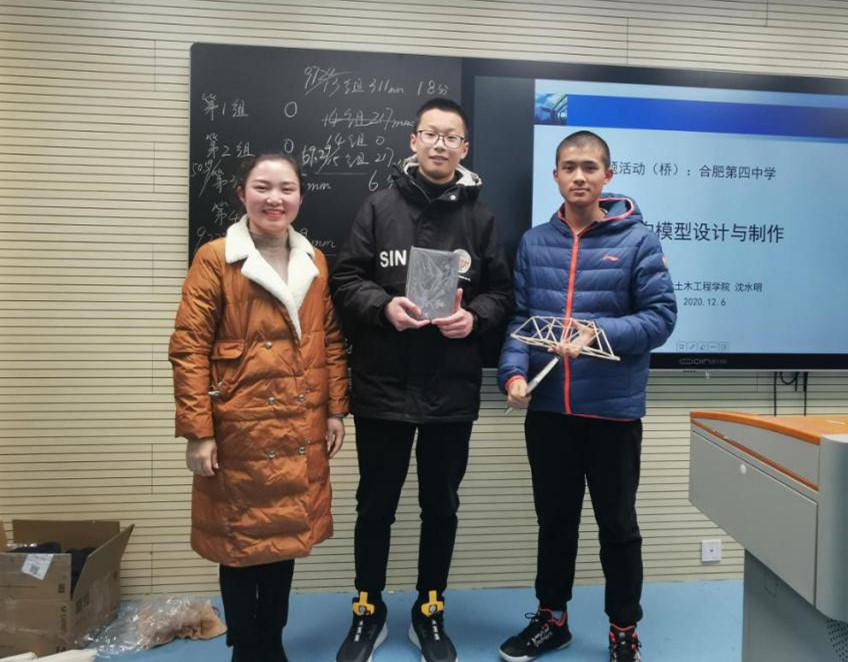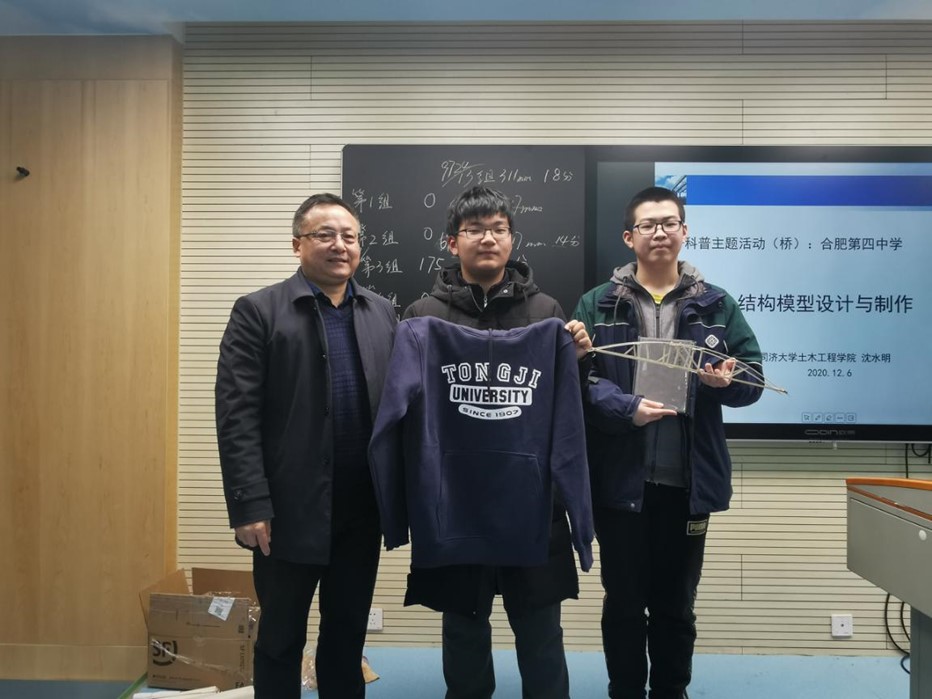 同济大学土木工程学院坚持多年举办全国高中生结构设计挑战赛,该比赛可以有效提高学生的问题分析能力、实践能力,培养学生的工程意识和社会责任感。合肥四中学子2019年在合肥工业大学高鹏教授的介绍和指导下参加了该比赛。由于疫情影响今年比赛未能如期举办,但沈教授亲自来到四中举办结构设计科普活动,让更多同学得到了学习和锻炼,大家倍感珍惜和感动!期待未来,合肥四中可以有更多学子热爱结构设计,逐步成长为卓越的工程师!