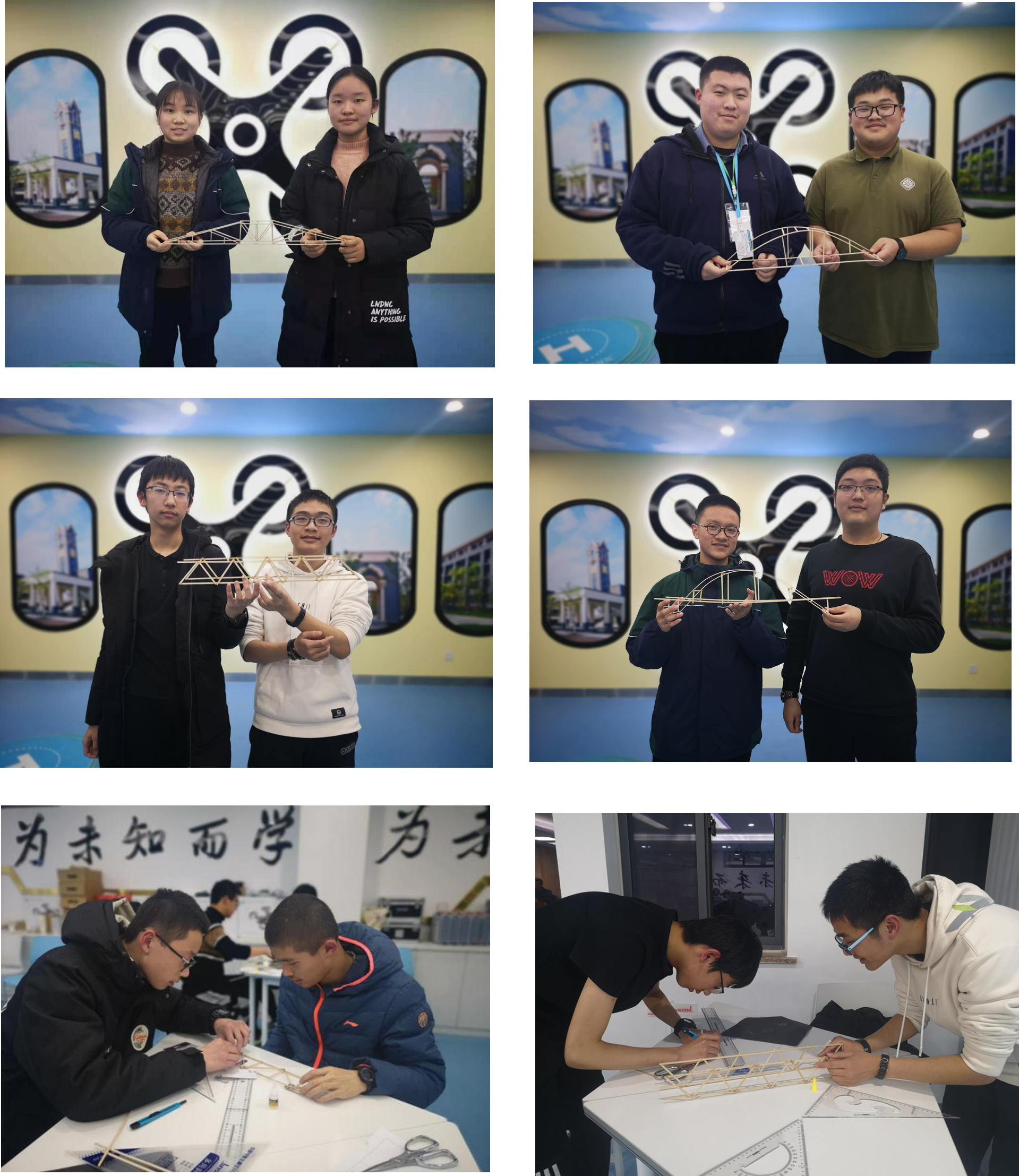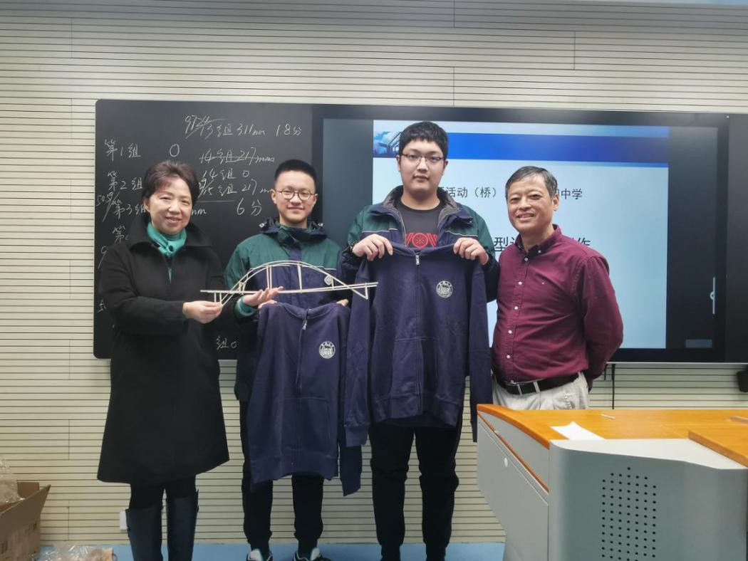 讲座结束后,沈教授给四中学子就桥梁结构设计开设了一场别开生面的科普活动。带领同学们分析设计桥梁结构,通过简易的工具制作出桥梁结构模型,并通过加载重物进行测试。将原本深奥复杂的力学知识融入实践活动中,给学生带来了不一般的学习体验。同学们两人一小组,进行设计制作。合肥工业大学高鹏教授也全程陪同指导。经过了两个小时的制作之后,沈教授对每个小组作品进行测试点评,分析了各组作品的优缺点。最终从桥梁跨度、承重能力以及方案设计等不同角度对小组作品进行打分,评选出前三名的小组并颁发了同济大学特色卫衣和笔记本。参加的同学们纷纷表示获益匪浅!