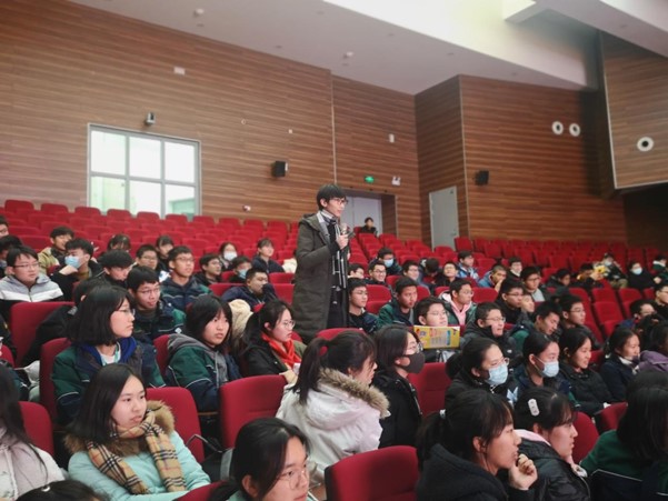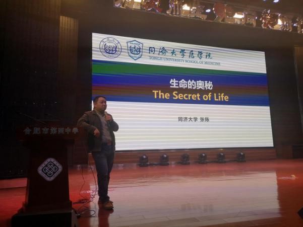 张陈教授是同济大学实验动物中心执行主任、同济大学医学院办公室主任、高级工程师,主要从事肿瘤生物学研究,集中聚焦于肿瘤发生发展以及相关信号通路的研究。张教授首先向大家介绍了同济大学近年来在安徽省招生的概况,通过鸟瞰图带领大家领略同济大学的美丽风景。绿树成荫的校园、宽敞明亮的体育馆、菜品丰盛的食堂、设备先进的实验室等等,让广大四中学子对同济有了更加深刻的认识以及向往。随后,张教授以《生命的奥秘》为主题,通过诙谐而生动的语言和大家分享了关于生命最本质的奥秘——基因。张教授讲座期间与四中学子进行问答互动,还给答对的同学赠送了同济大学特色优盘,会场气氛十分活跃。