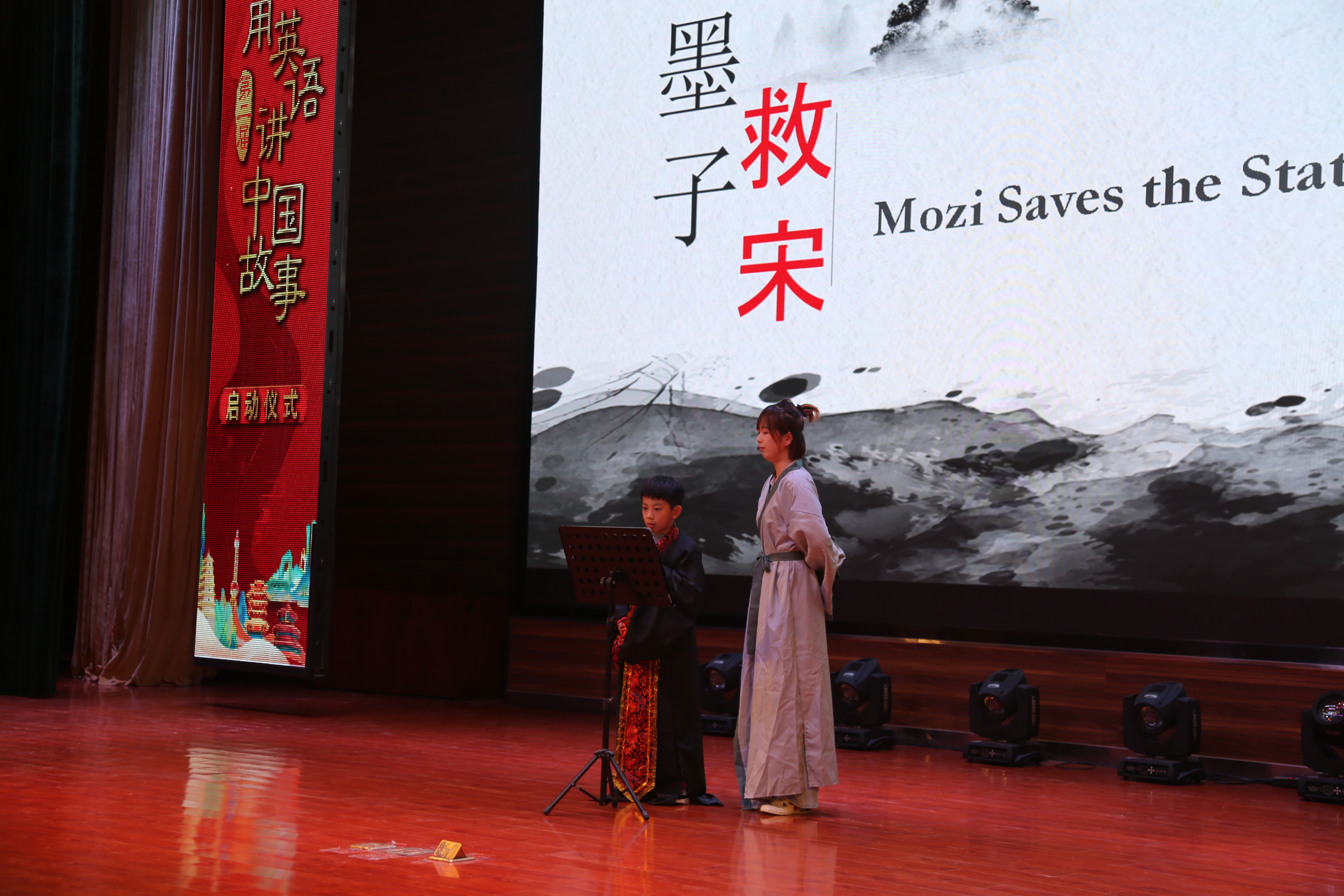 本届活动由合肥四中邸书冉、祁礼杨老师担任中英文双语主持。启动仪式的开始,合肥四中合唱团在余慧老师的带领下演出合唱“启程”,预示着本届活动圆满启航。新航道学校阮瑶老师、石子牧同学表演英文朗诵《墨子救宋》。