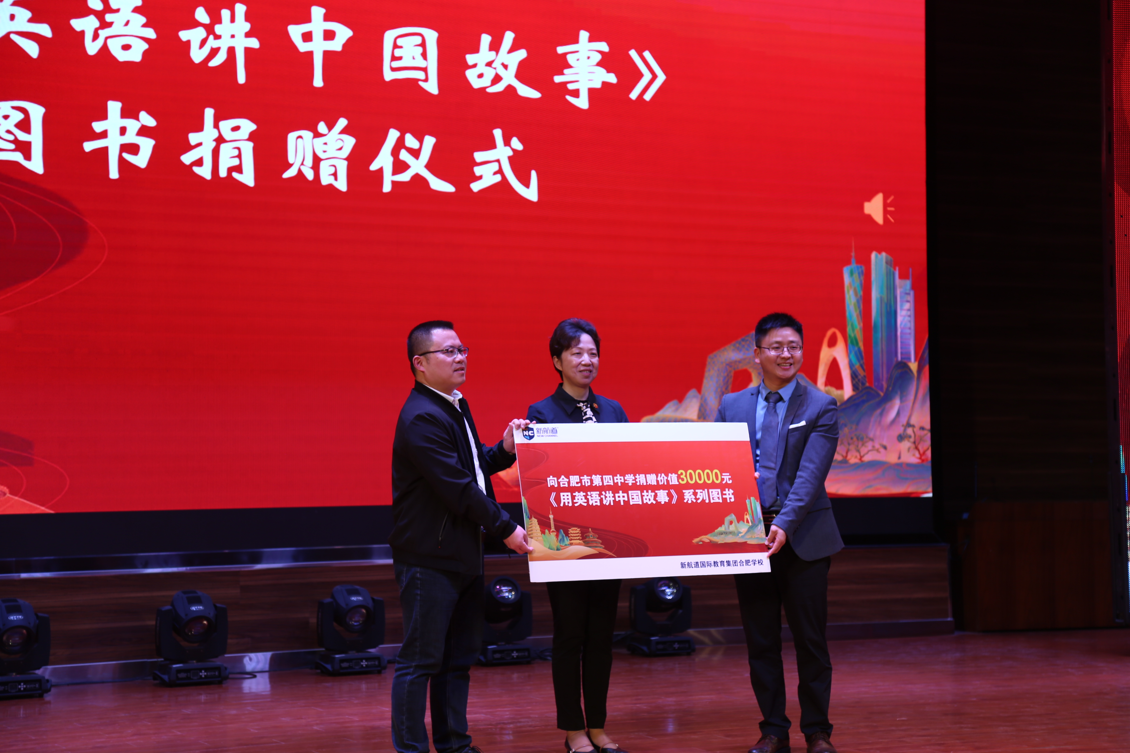 活动的结束,新航道学校向合肥四中捐赠《用英语讲中国故事》图书,合肥四中校长吴英明专程从厦门的会议中赶回现场,支持本届活动的开展,合肥四中党委书记、校长吴英明、副校长彭强接受新航道学校余航校长向校方赠书并亲切合影。