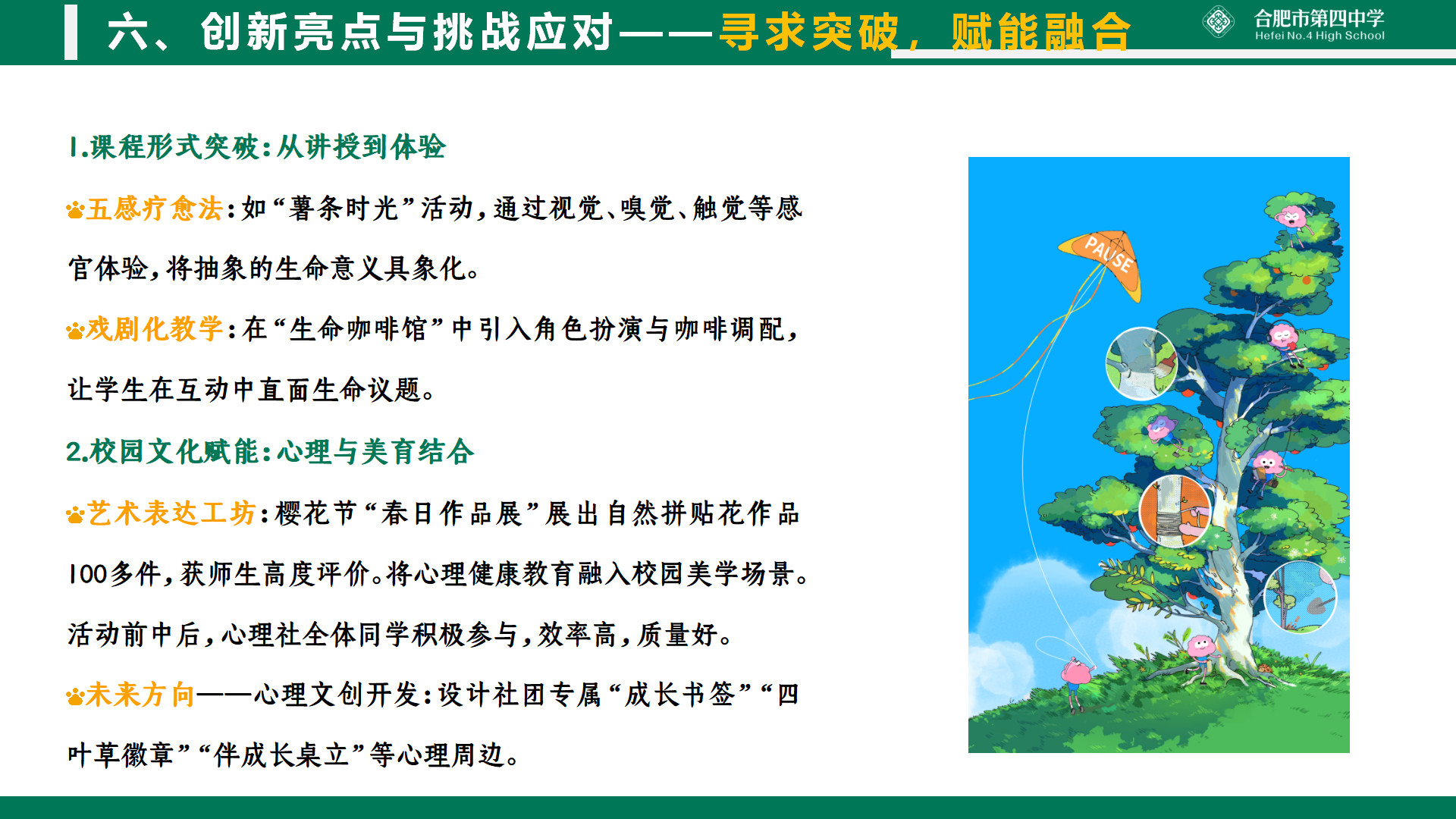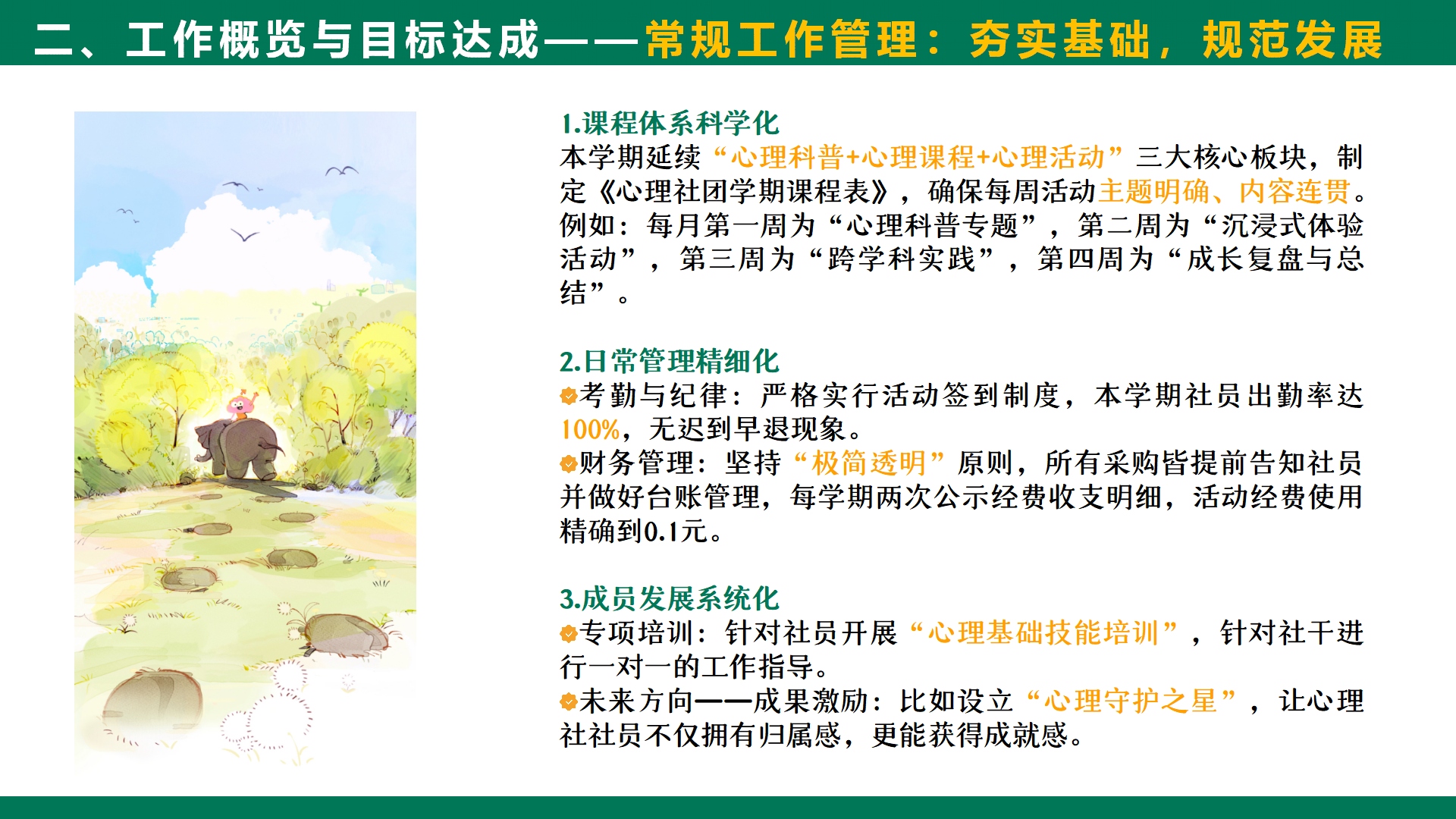 本学期,社团实现多项突破:100%社员掌握“危机信号识别”等基础技能,10名社员在辩论赛、艺术创作等领域获校级以上奖项;樱花艺术节中展出的100余件自然拼贴作品,获师生一致好评。未来,社团计划推出主题曲《心光》及心理文创产品,并积极申报课题研究,推动实践成果向学术转化。