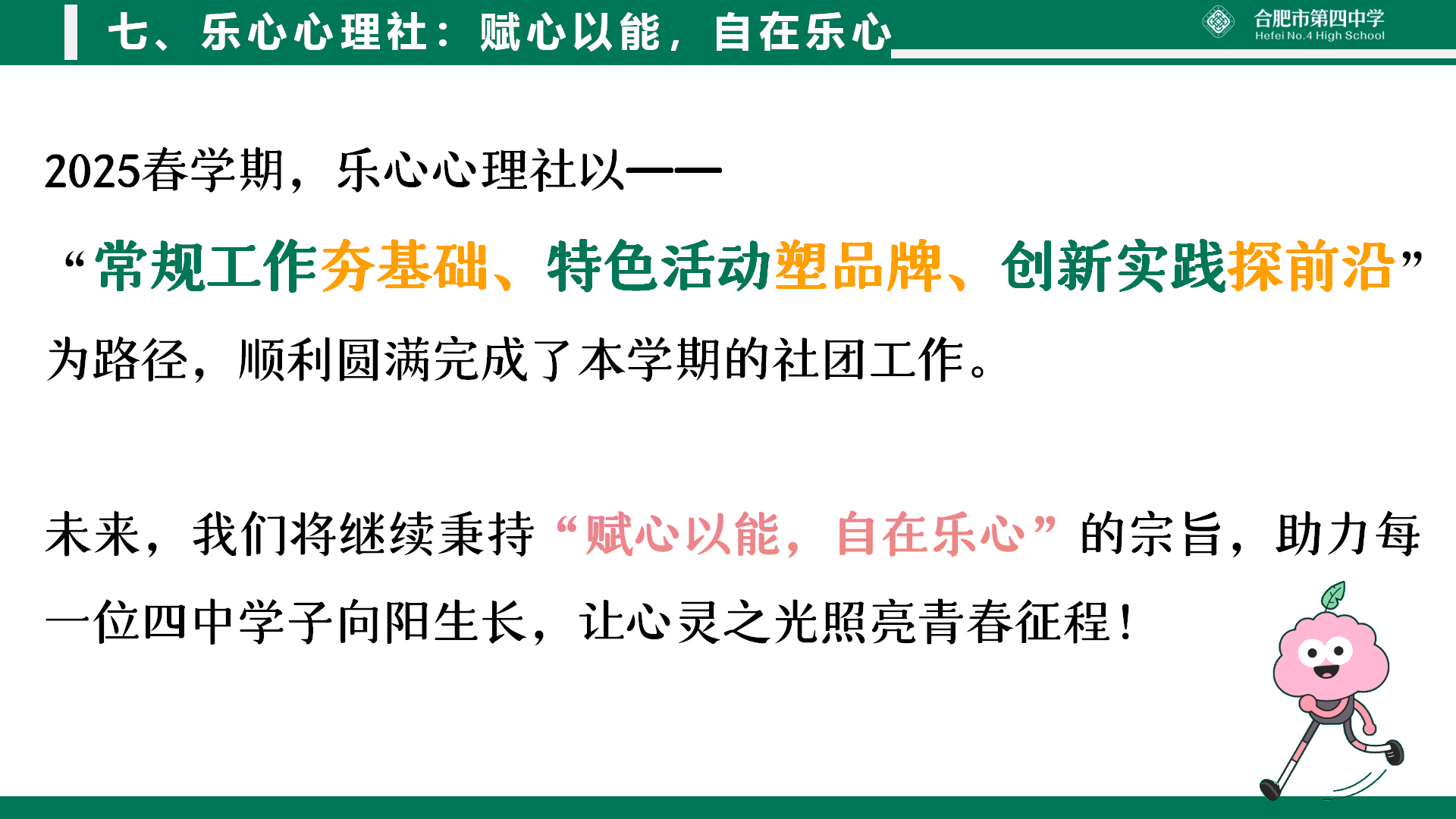 2025春学期,乐心心理社以“常规工作夯基础、特色活动塑品牌、创新实践探前沿”为路径,顺利圆满完成了本学期的社团工作。春去夏来,步履不停。未来,我们将继续秉持“赋心以能,自在乐心”的宗旨,深耕五育融合实践,助力每一位四中学子向阳生长,让心灵之光照亮青春征程!