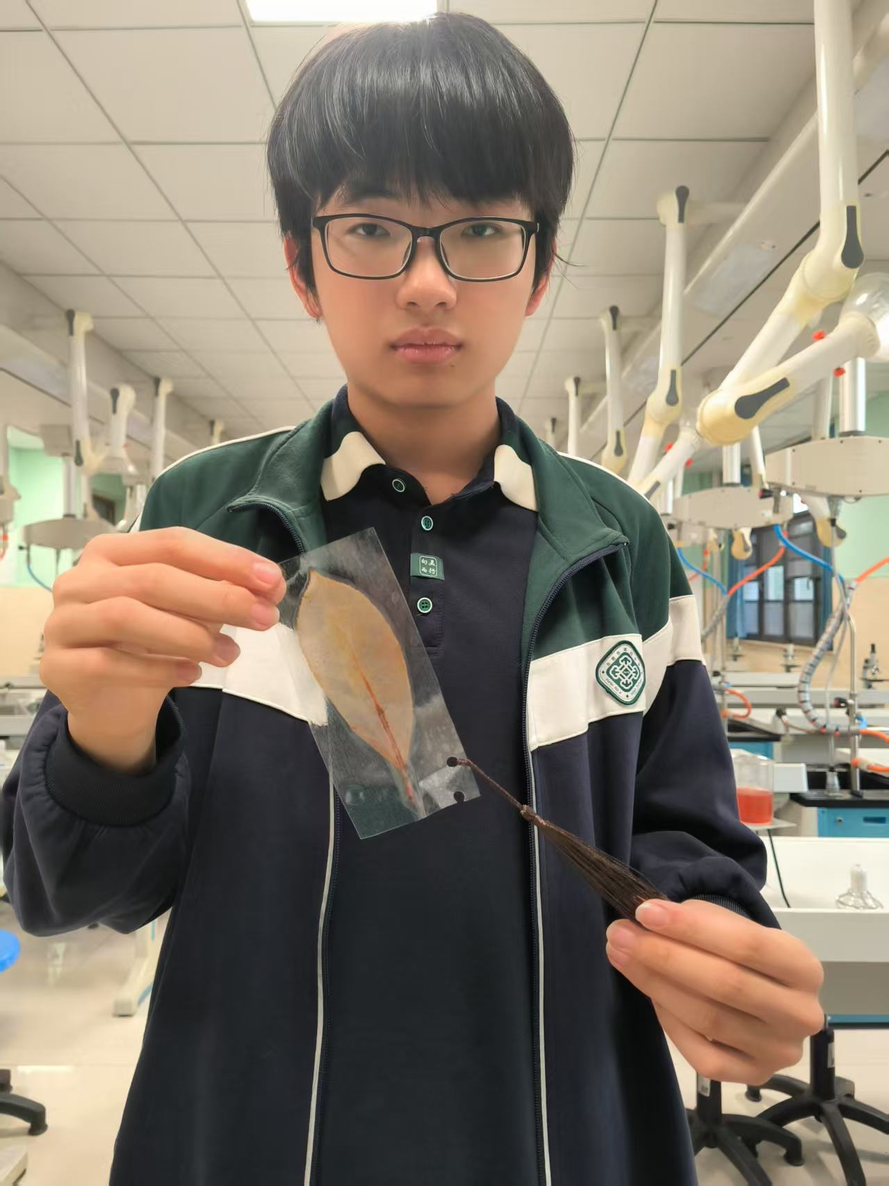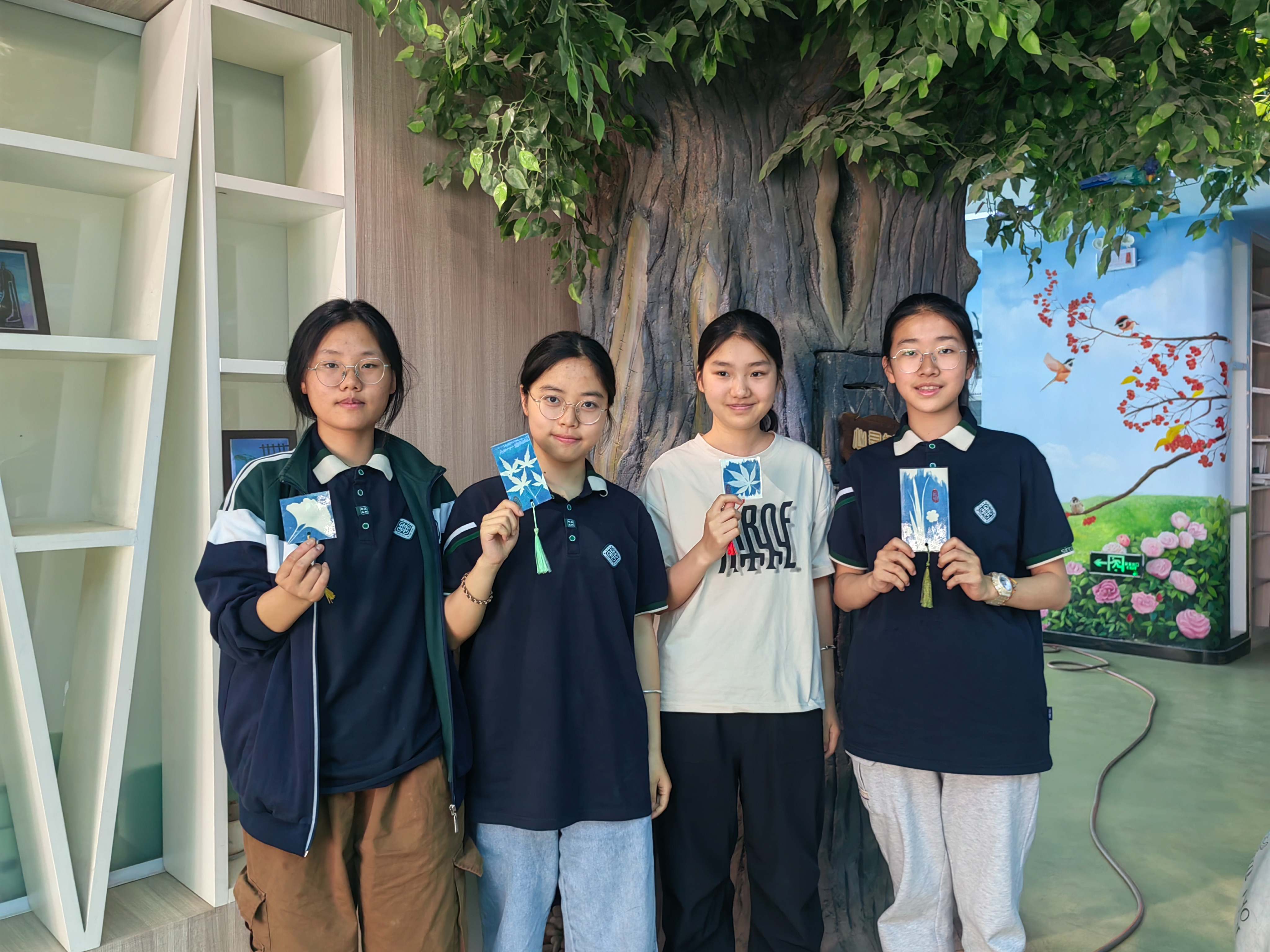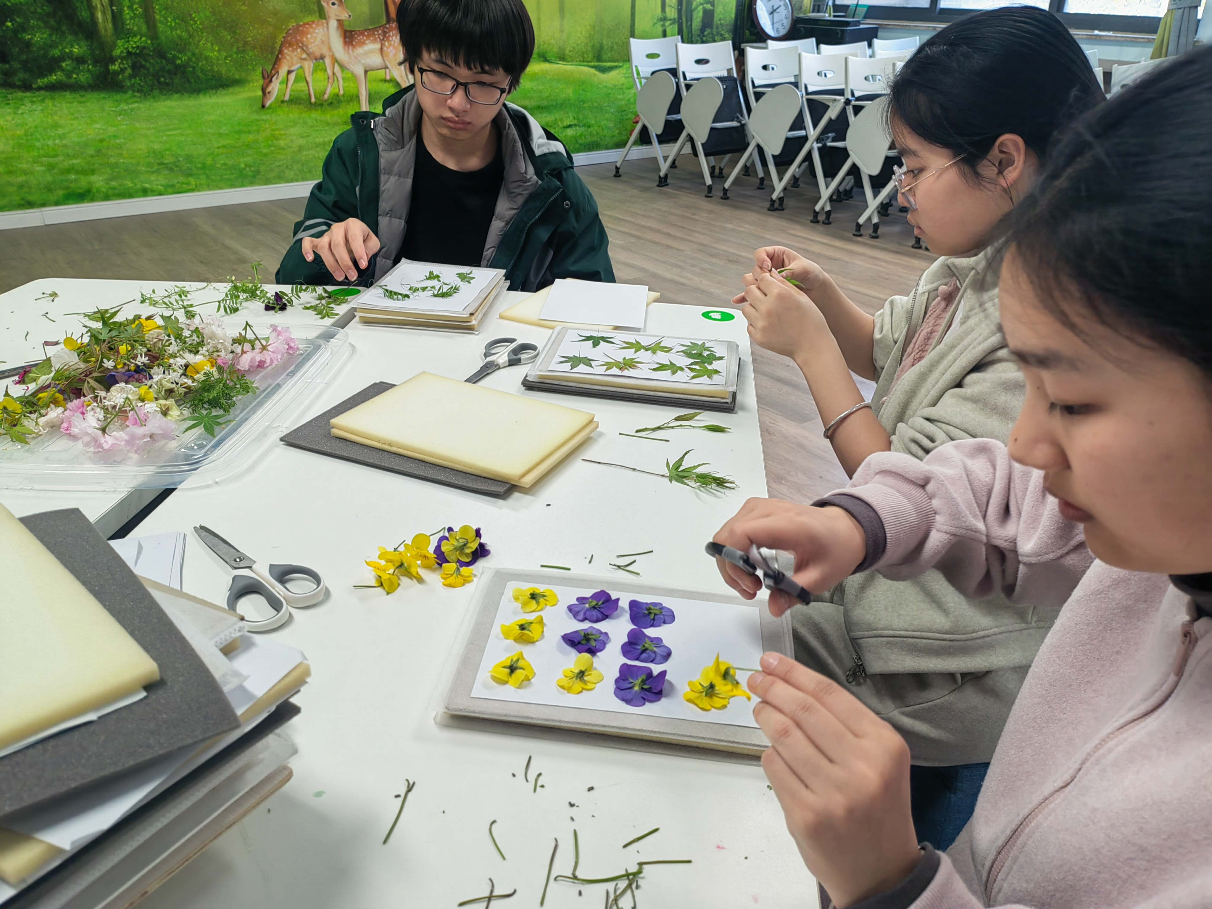 课程突破传统课堂边界,将自然科学转化为审美实践。学生们化身"自然艺术家",用植物拓印定格叶片纹理之美,以压花工艺留存四季芳华;在蓝晒书签制作中探索光影与化学的奥秘,用叶脉书签呈现生物结构的精妙;更有创意拼贴画将零落花瓣幻化成诗意画卷。生物实验室里,显微镜下的叶片细胞、花瓣组织成为另类"艺术品"。此次课程在校园内掀起"绿色风尚",教学楼走廊变身"植物艺术长廊",课间常有师生驻足欣赏。这方寸之间的绿意与诗意,正悄然播撒着生命教育、生态美育的种子,见证着五育融合育人的生动实践。