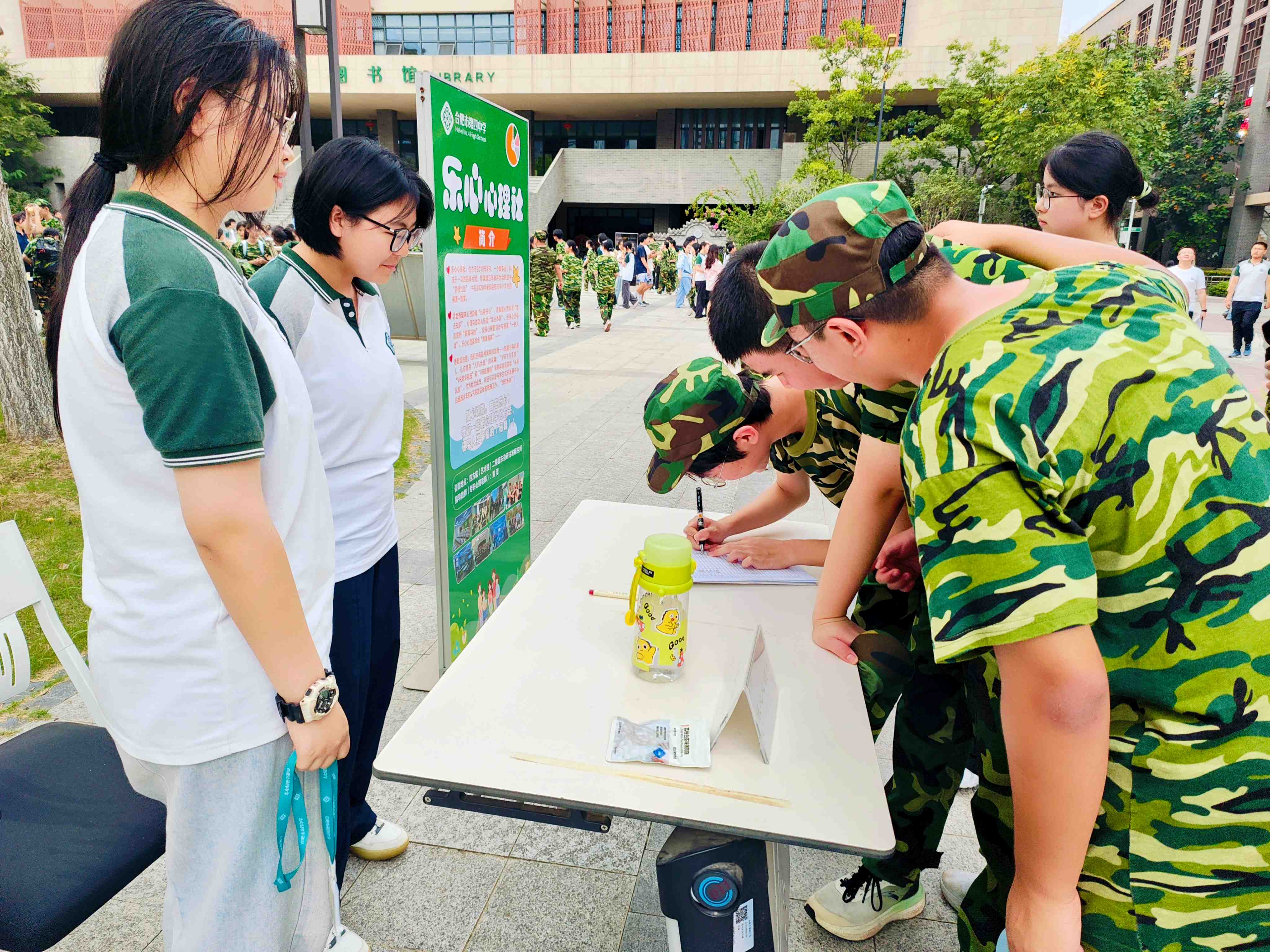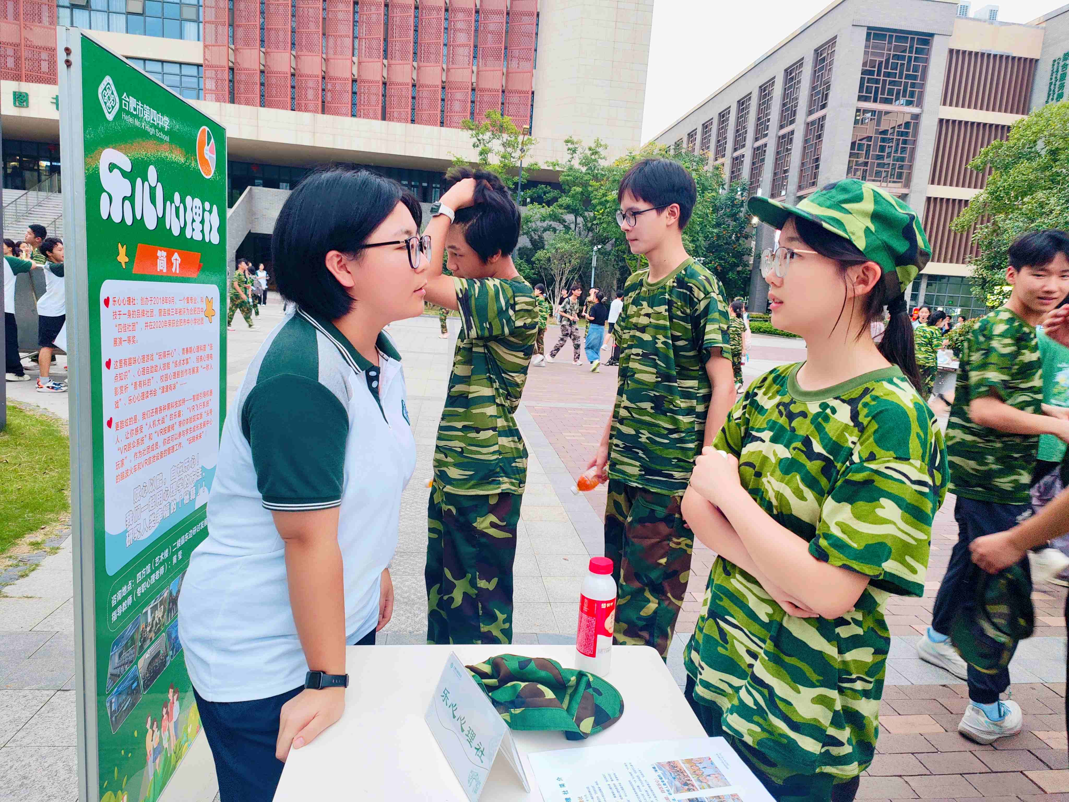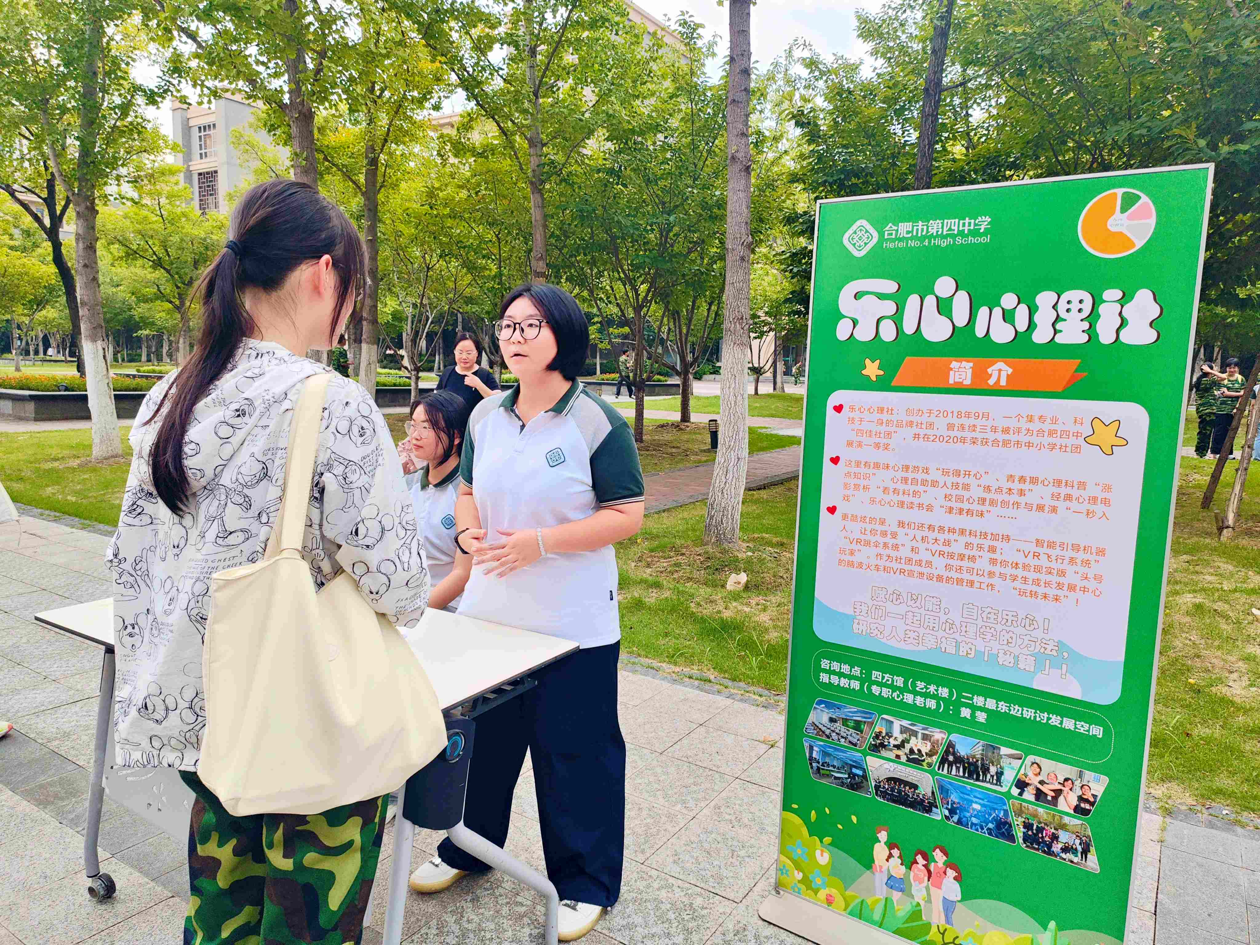 2025年9月3日下午,合肥四中第八届社团招新大会在景贤广场隆重举行,乐心心理社作为校级品牌社团参与了本次招新活动,由社团指导老师黄莹带领上一届社干胡恰恰、陈太北、袁浩冉、姚陶玉涵等同学,为高一新生提供详细介绍。