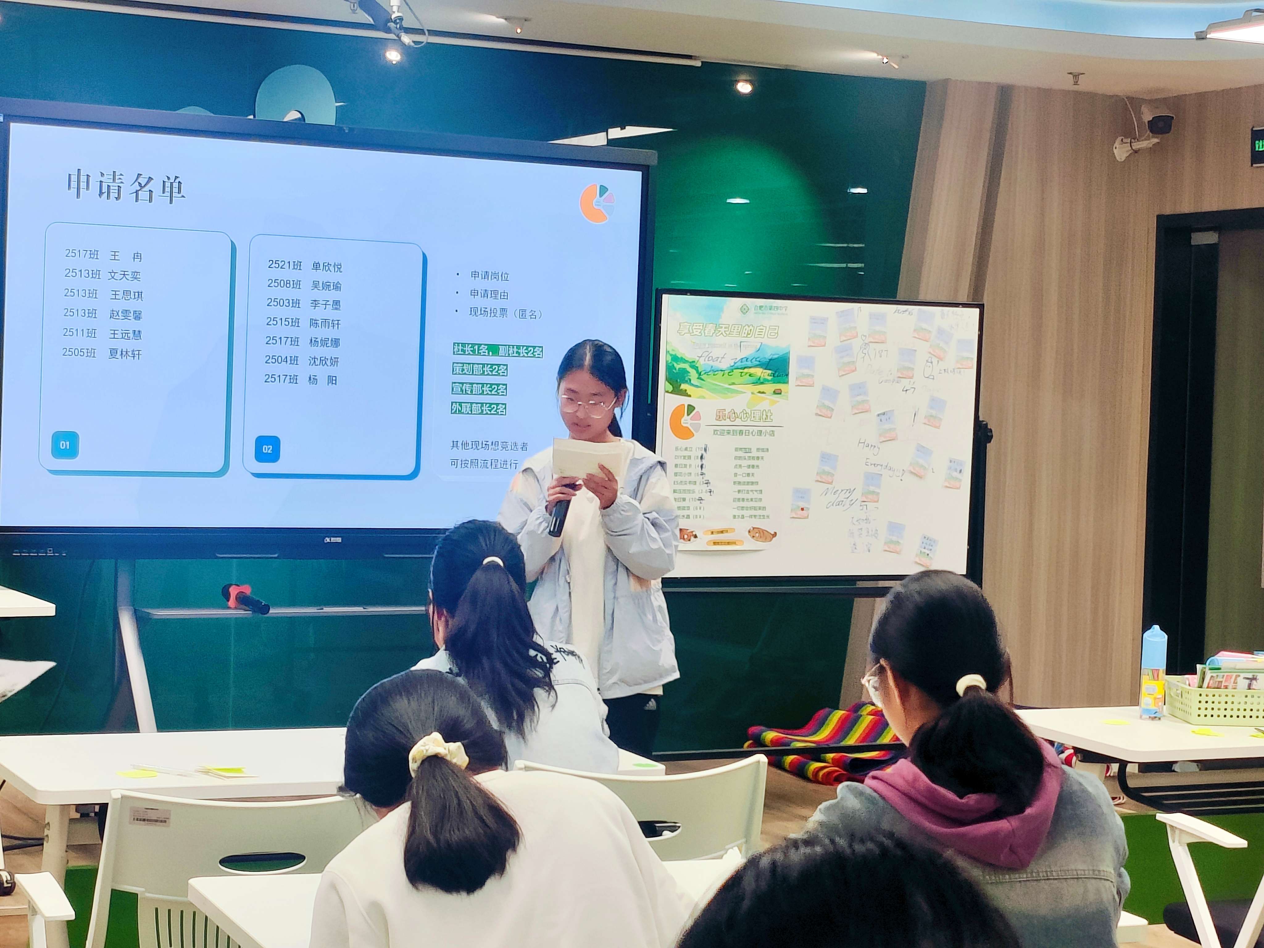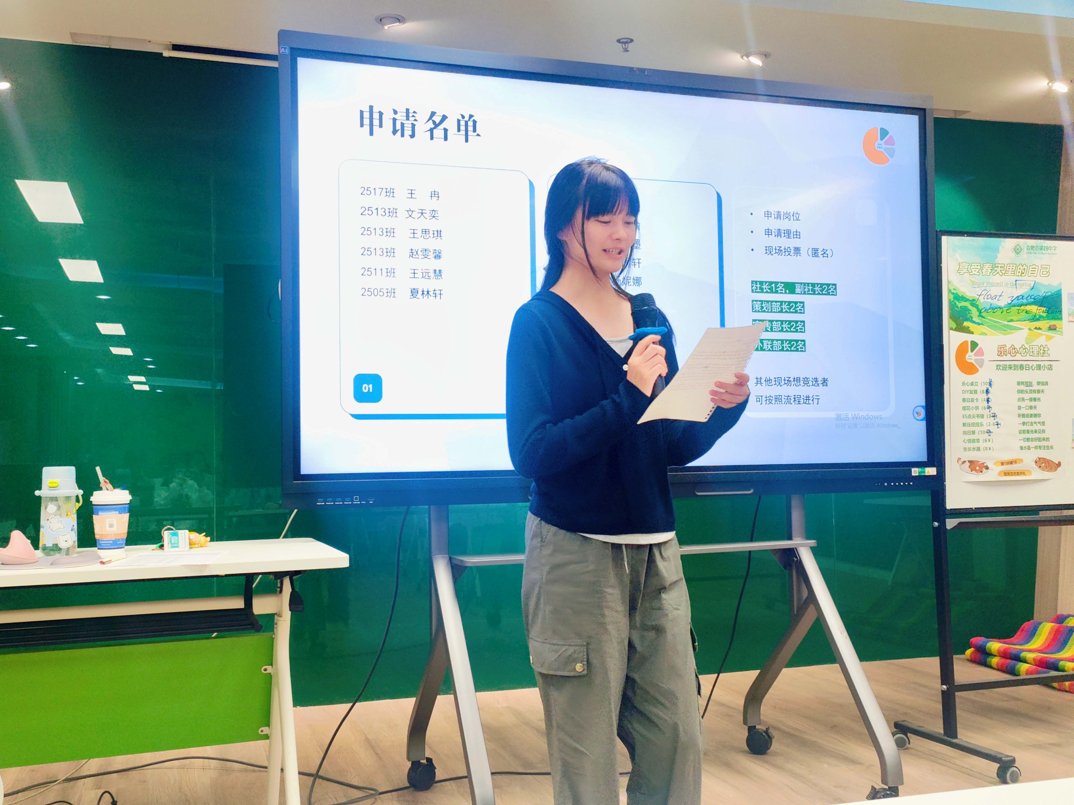 竞选同学们认真准备,依次上台陈述申请理由,表达服务意愿与工作设想。台下社员仔细聆听,积极参与投票,现场气氛庄重而热烈。经过规范有序的选举流程,新一届社干团队顺利产生。他们将肩负起组织协调、活动策划、宣传联络等职责,为社团注入新的活力。