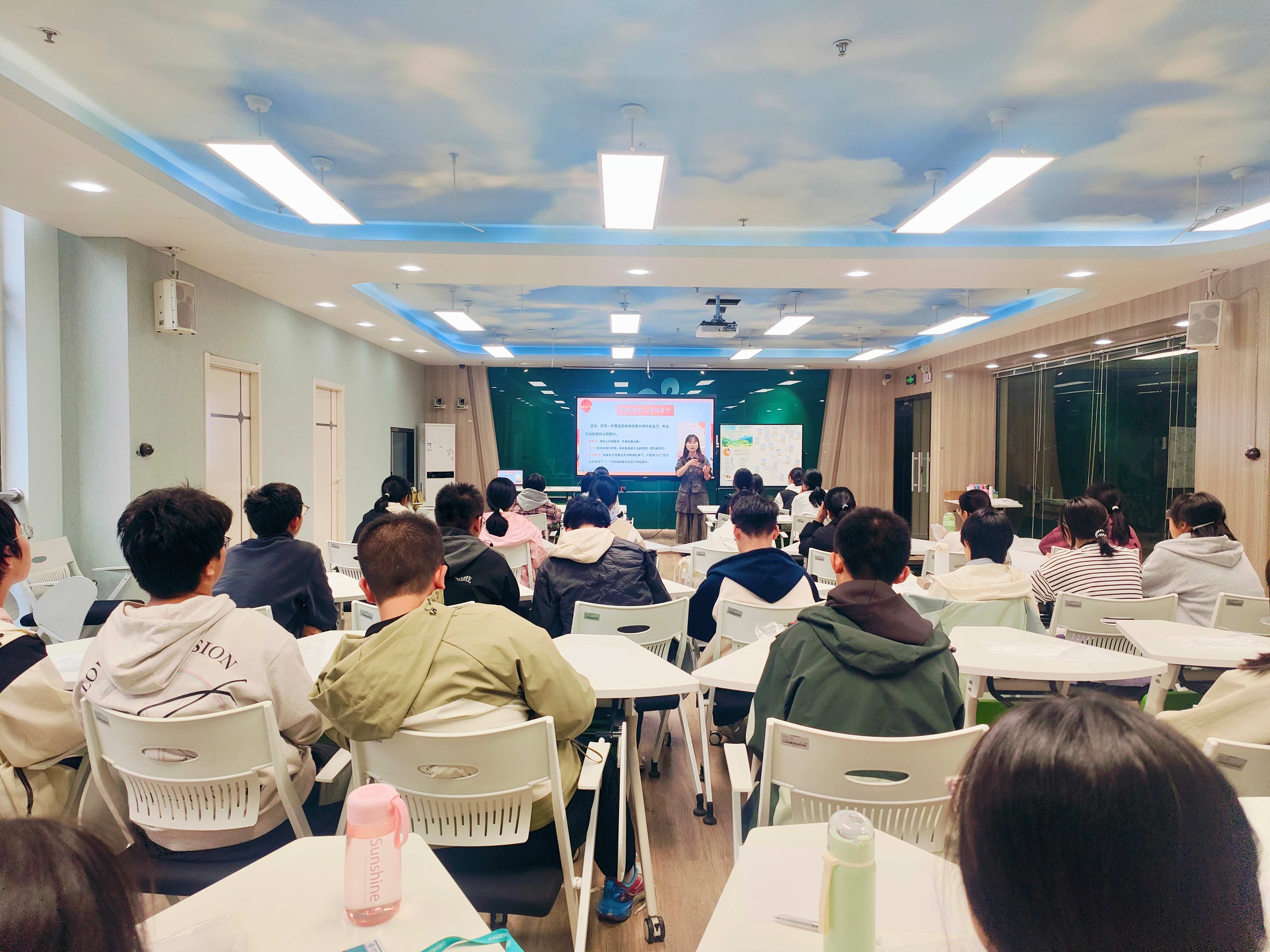 活动伊始,黄莹老师以“何为当下,为何当下”为引,向同学们介绍了正念的理念:“正念,就是一种有意识地将注意力保持在当下,并且不加评判的心理能力。”她鼓励大家在接下来的校园漫步中,调动五感,用心体会——“请用你明亮的眼睛,去寻找最动人的颜色;请用你敏锐的耳朵,静静倾听秋天的声音……”