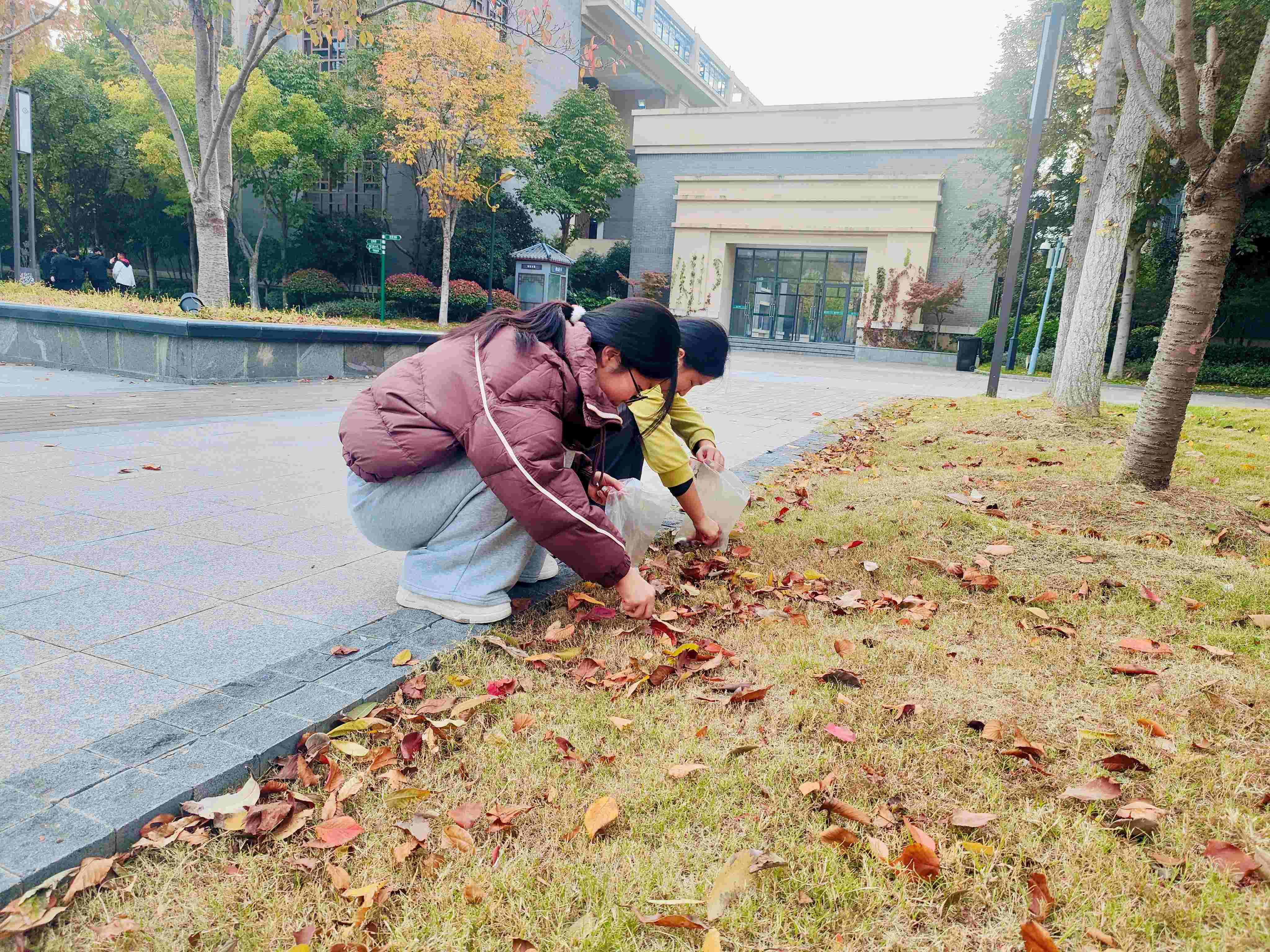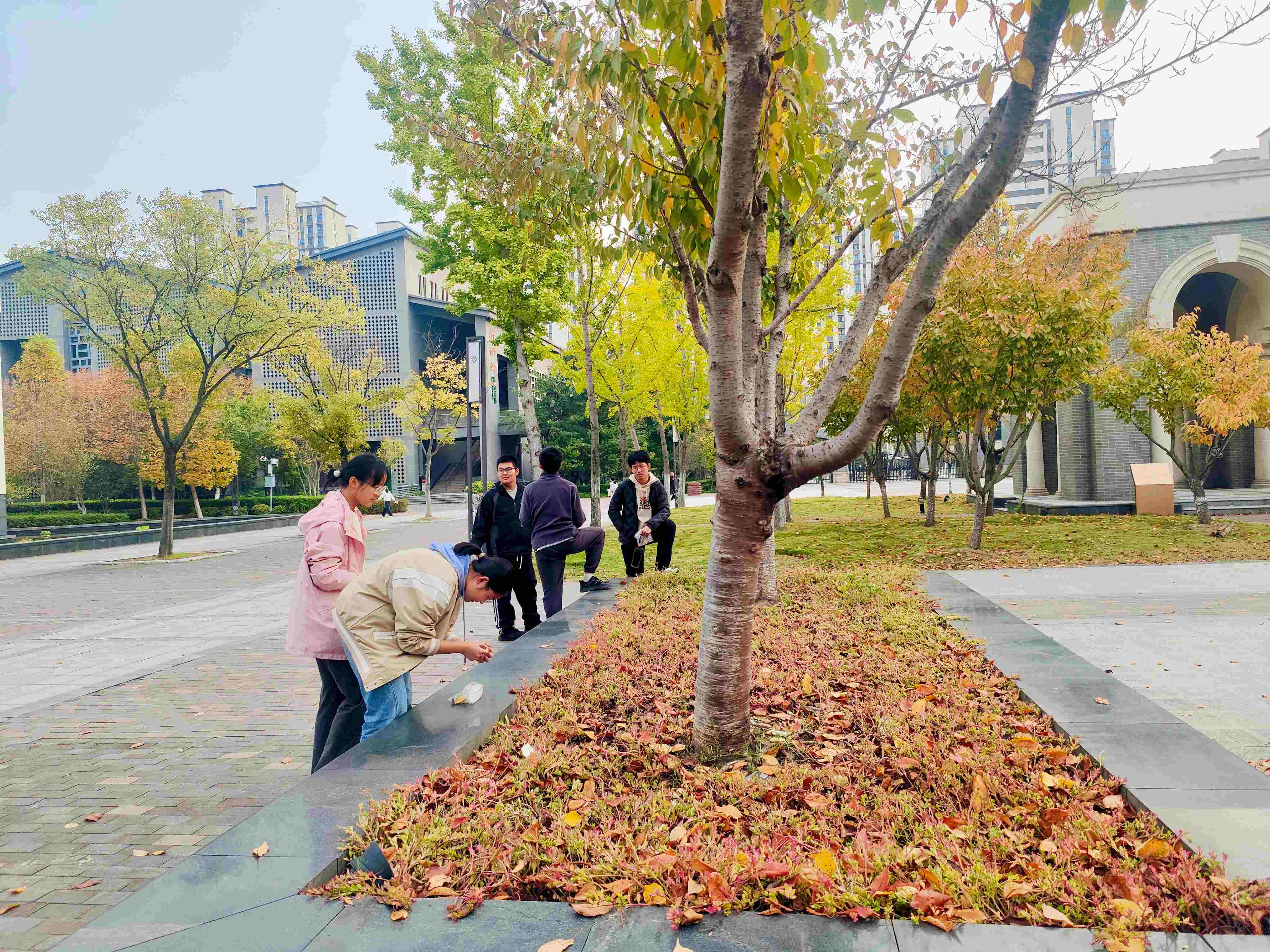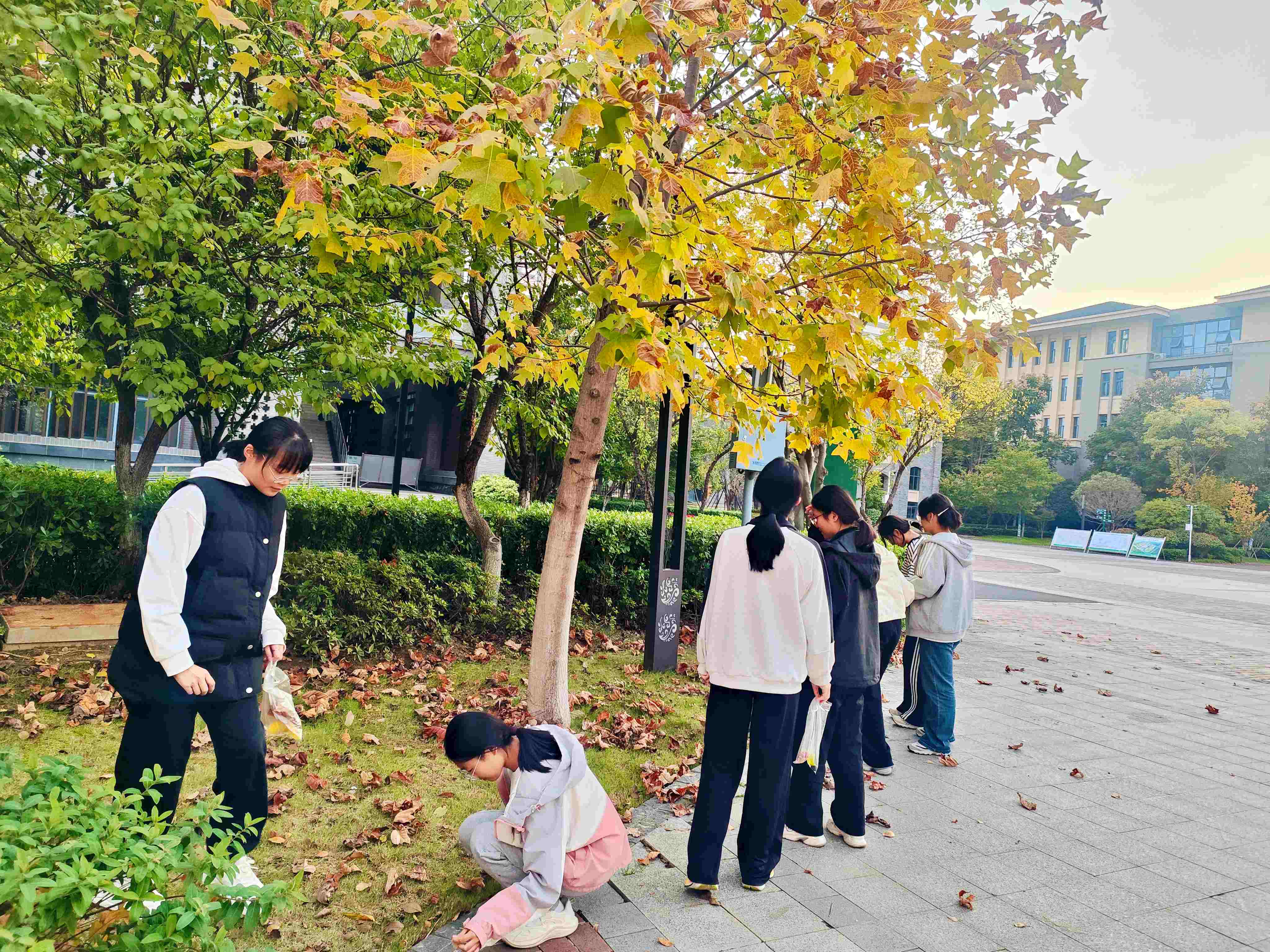 同学们手持小小的“宝藏袋”,化身“自然收藏家”,漫步于四中校园。有人拾起一片脉络清晰的银杏,有人轻嗅残留花香的落蕊,有人触摸树皮的粗糙纹理,有人静听风吹叶落的沙沙声响……每一片落叶、每一颗石子,都成为承载此刻感受的“自然信物”。