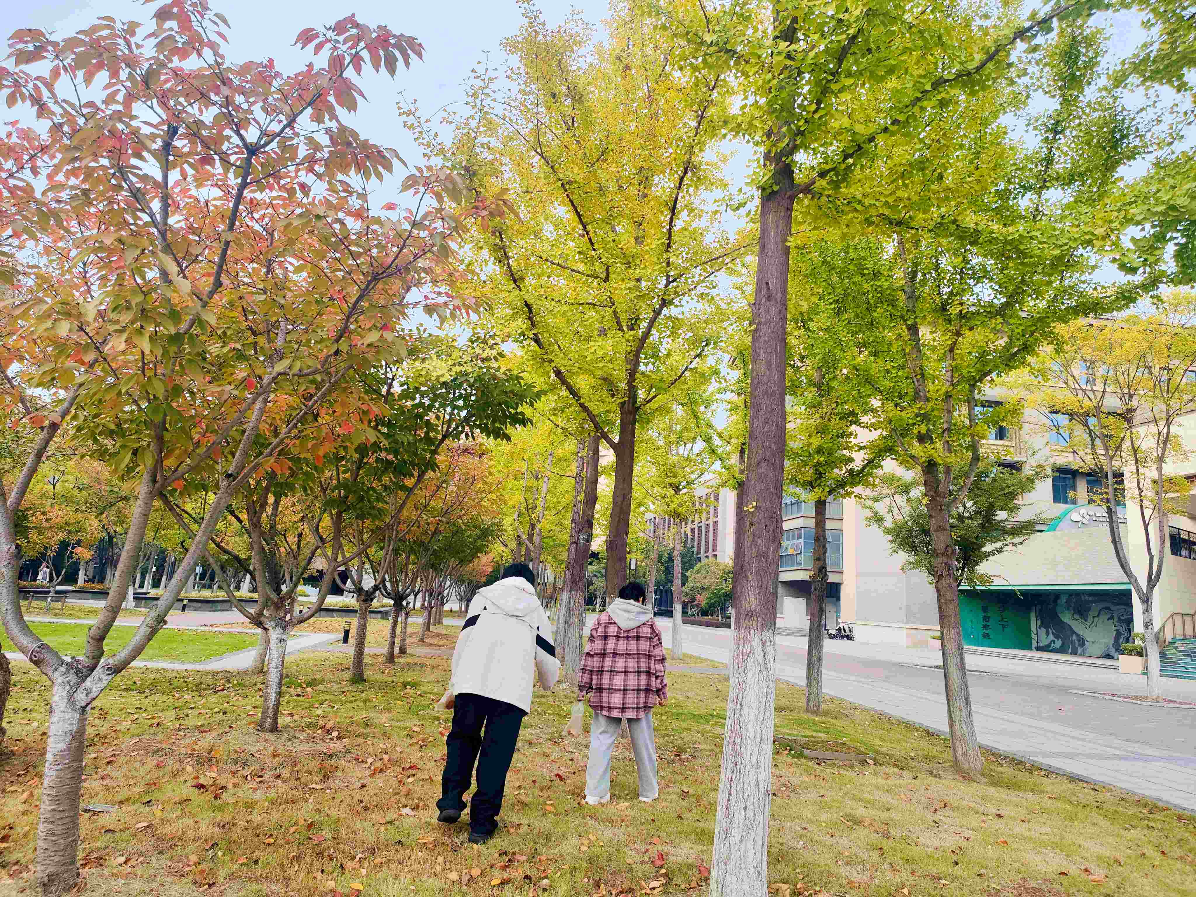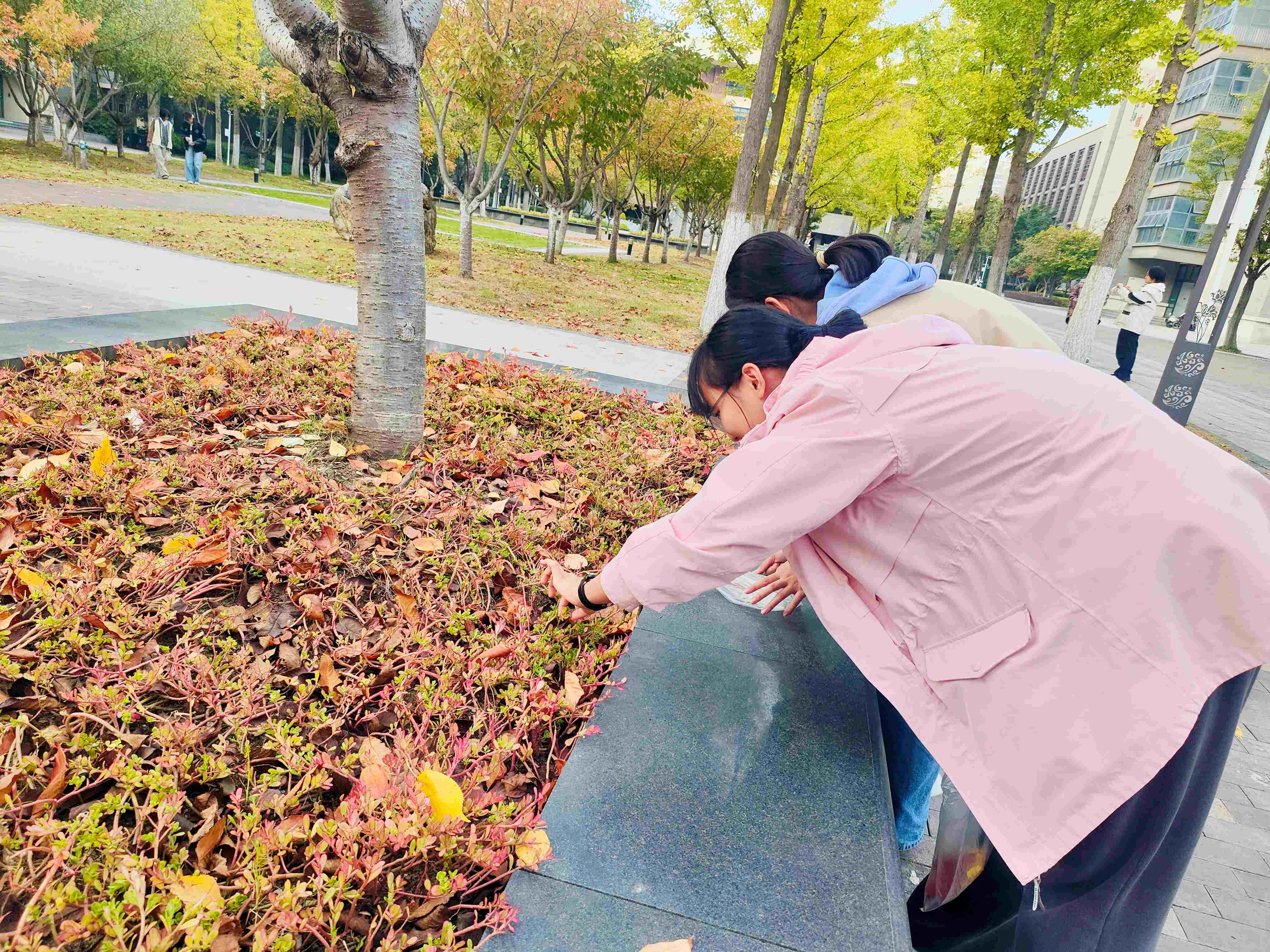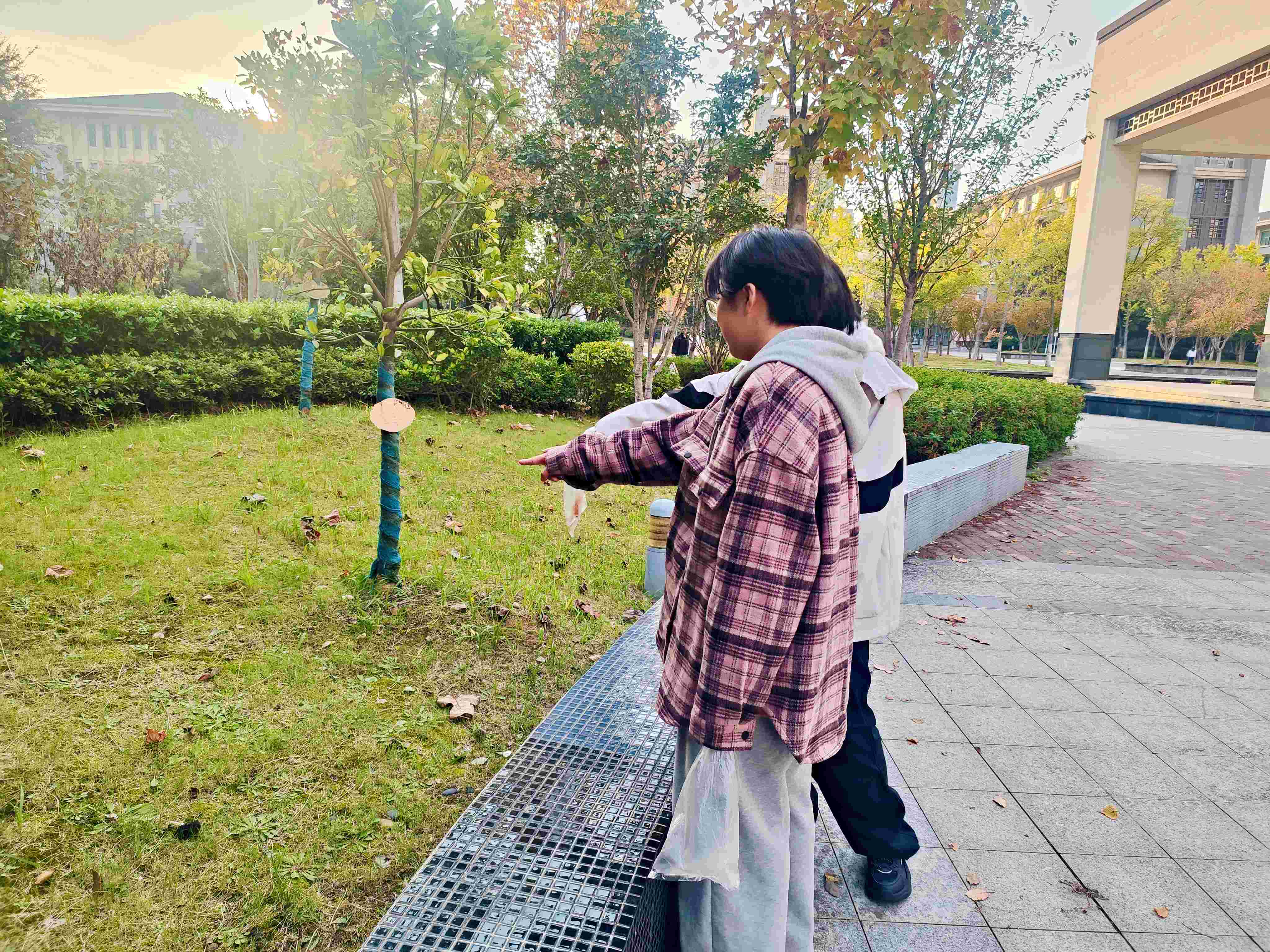 同学们手持小小的“宝藏袋”,化身“自然收藏家”,漫步于四中校园。有人拾起一片脉络清晰的银杏,有人轻嗅残留花香的落蕊,有人触摸树皮的粗糙纹理,有人静听风吹叶落的沙沙声响……每一片落叶、每一颗石子,都成为承载此刻感受的“自然信物”。