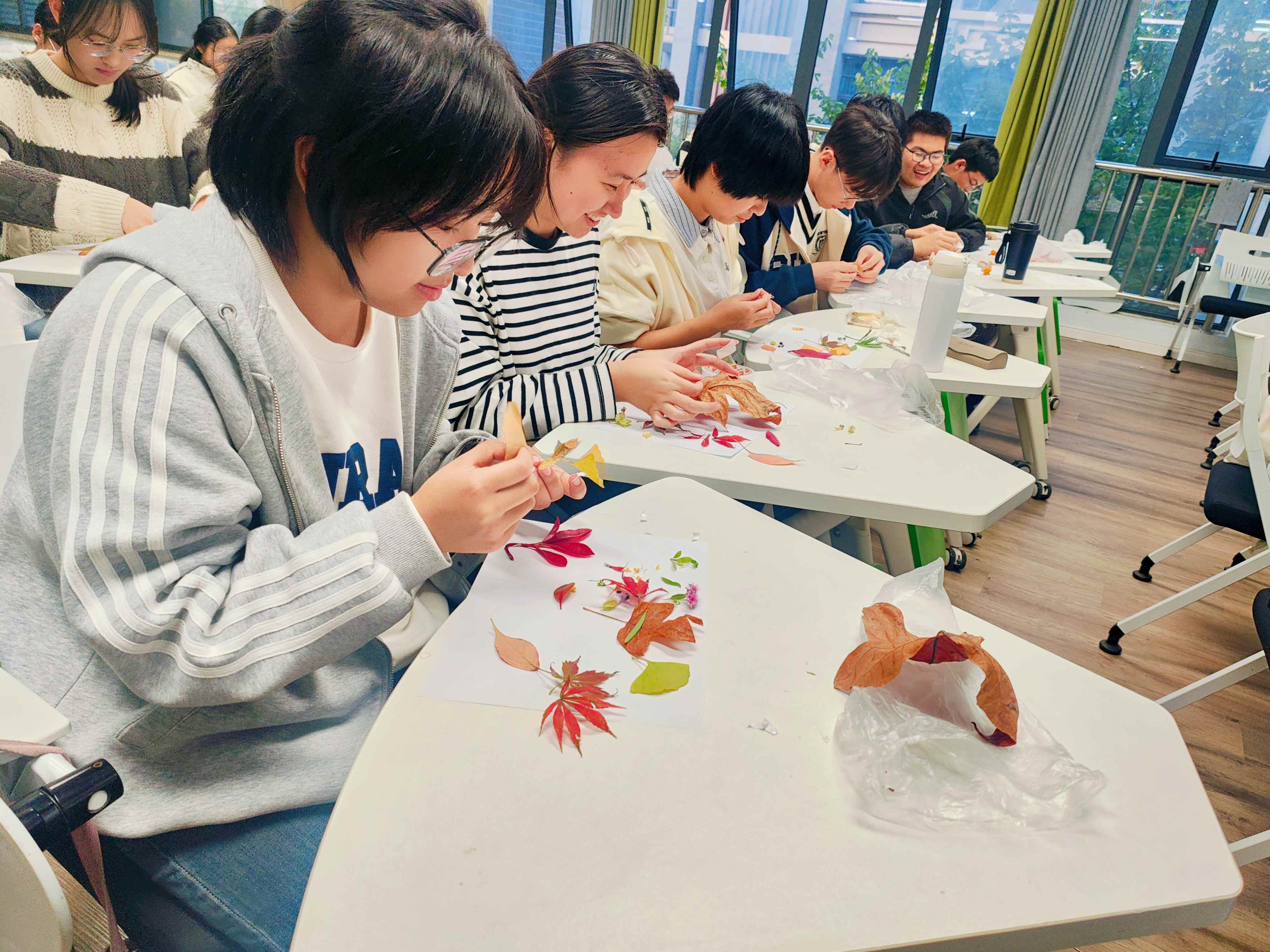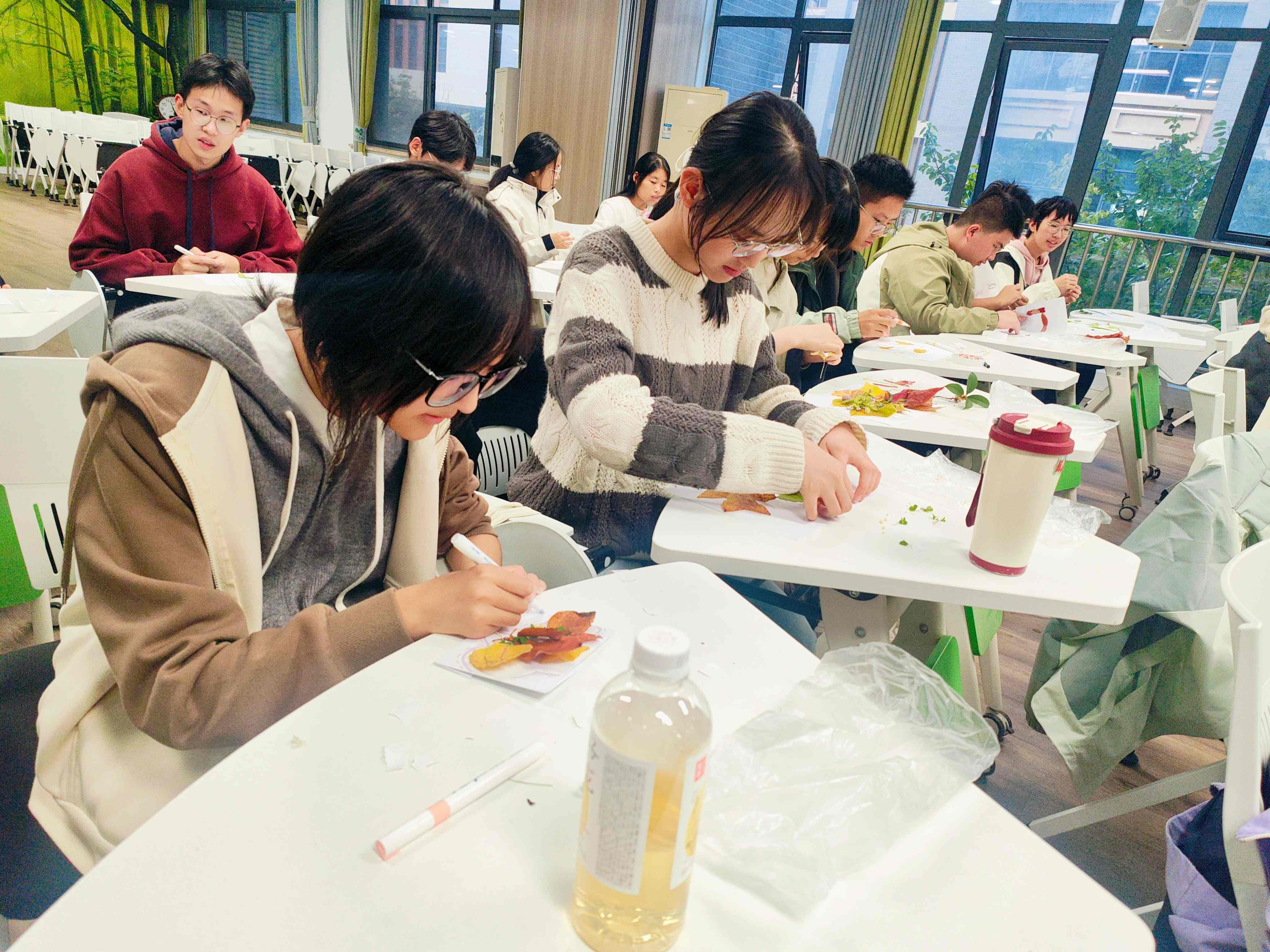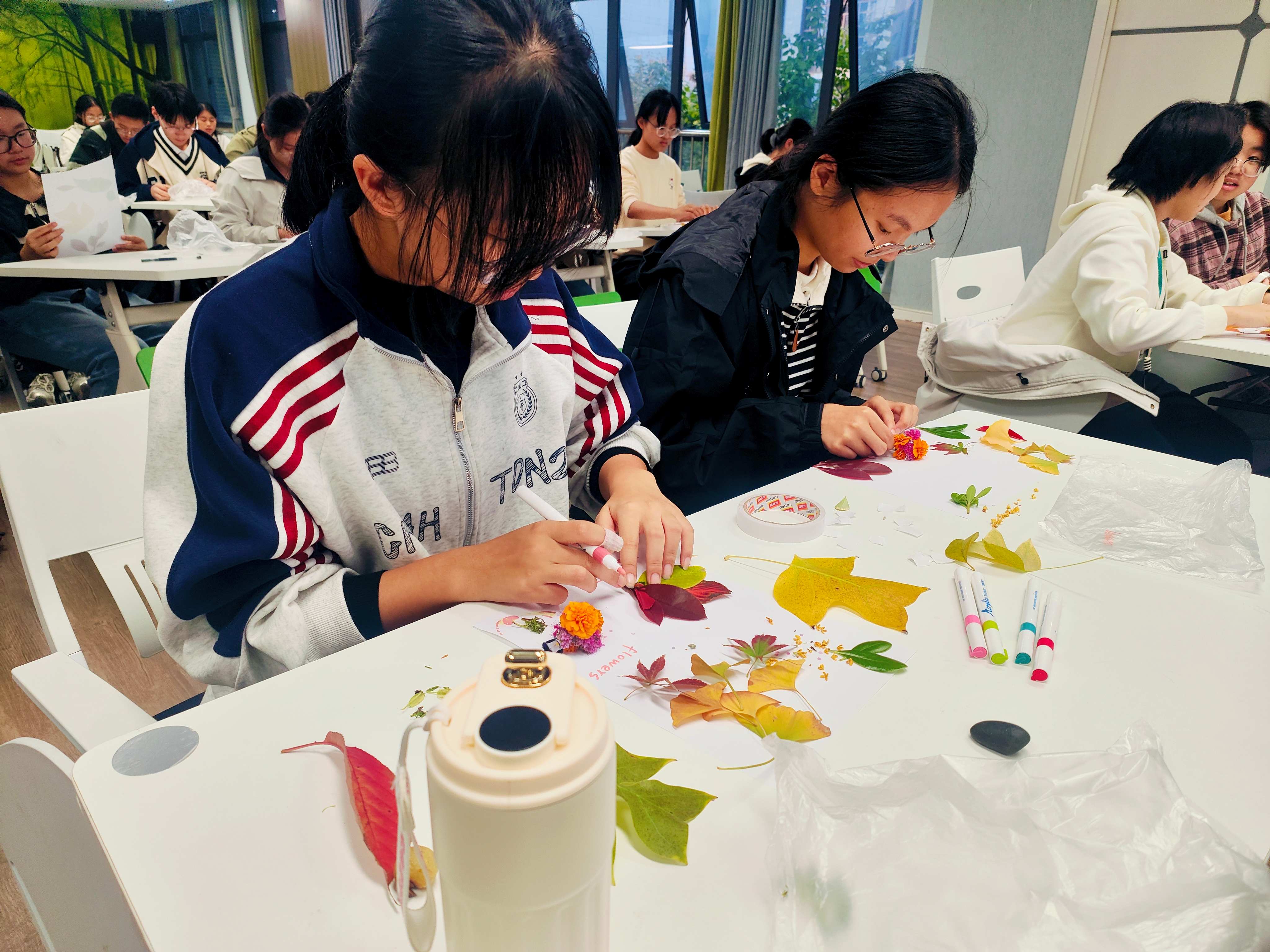 带着收集到的秋日素材,同学们重返活动室,在一张共同的“秋天画布”上,开始创意拼贴与绘画。大家借助树叶、花瓣与彩笔,将眼中的秋天、心中的季节,转化为一幅幅充满个性的作品。有同学用层层叠叠的落叶拼出“时间的年轮”,也有同学以金黄与深褐绘出“暖光与寒枝的交界”。