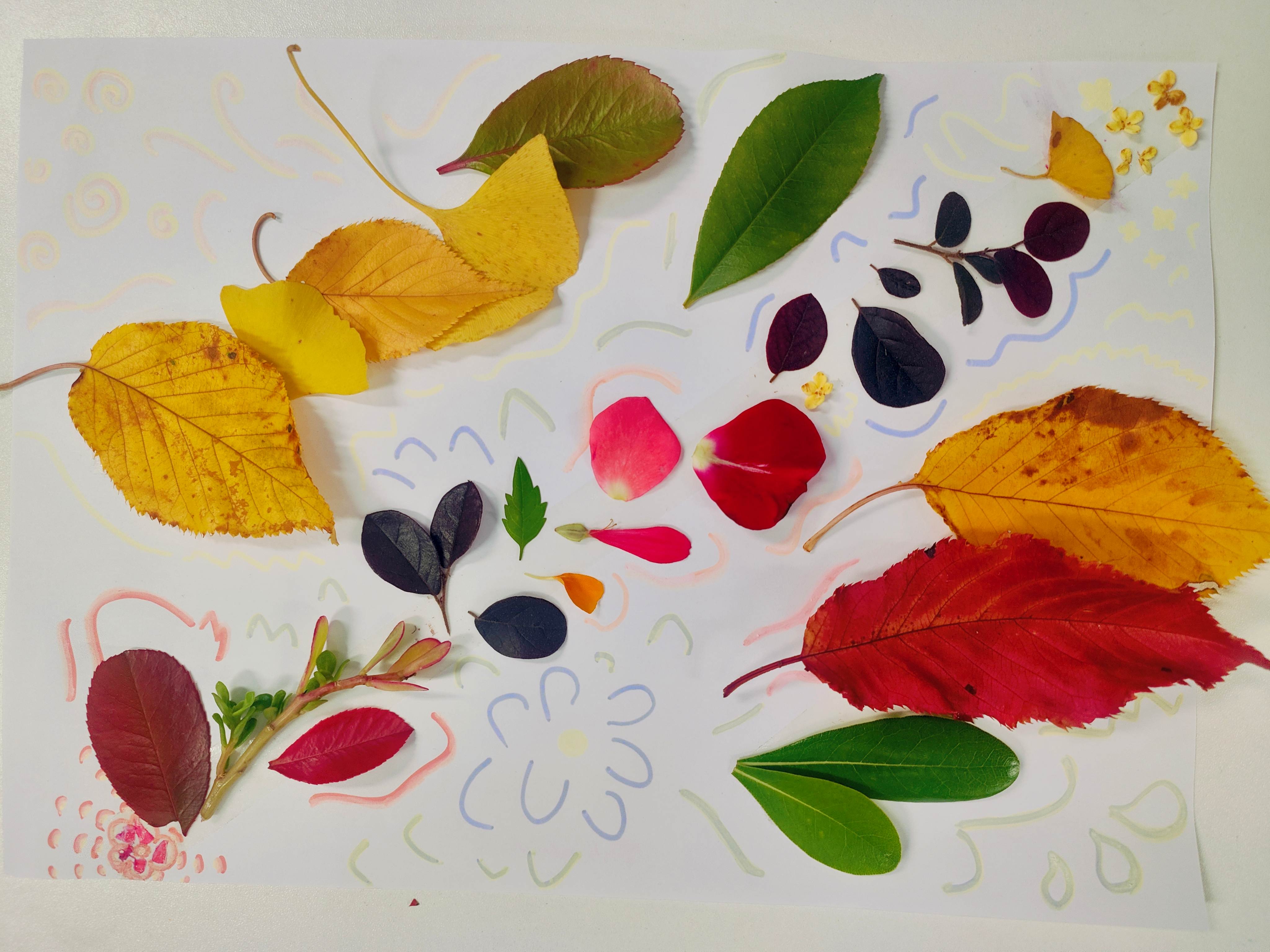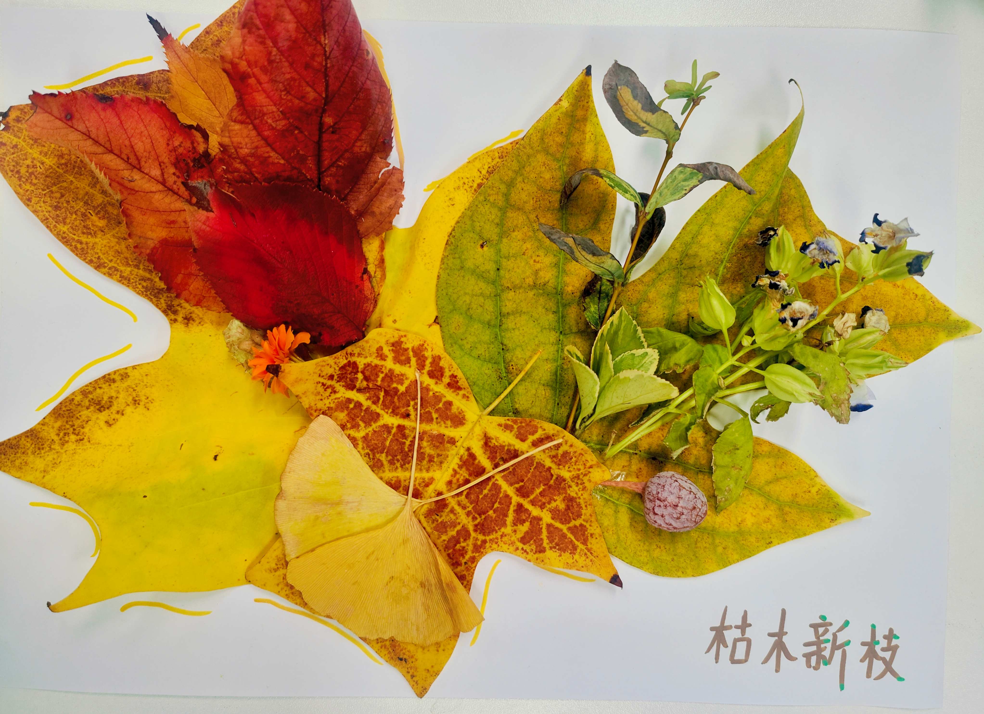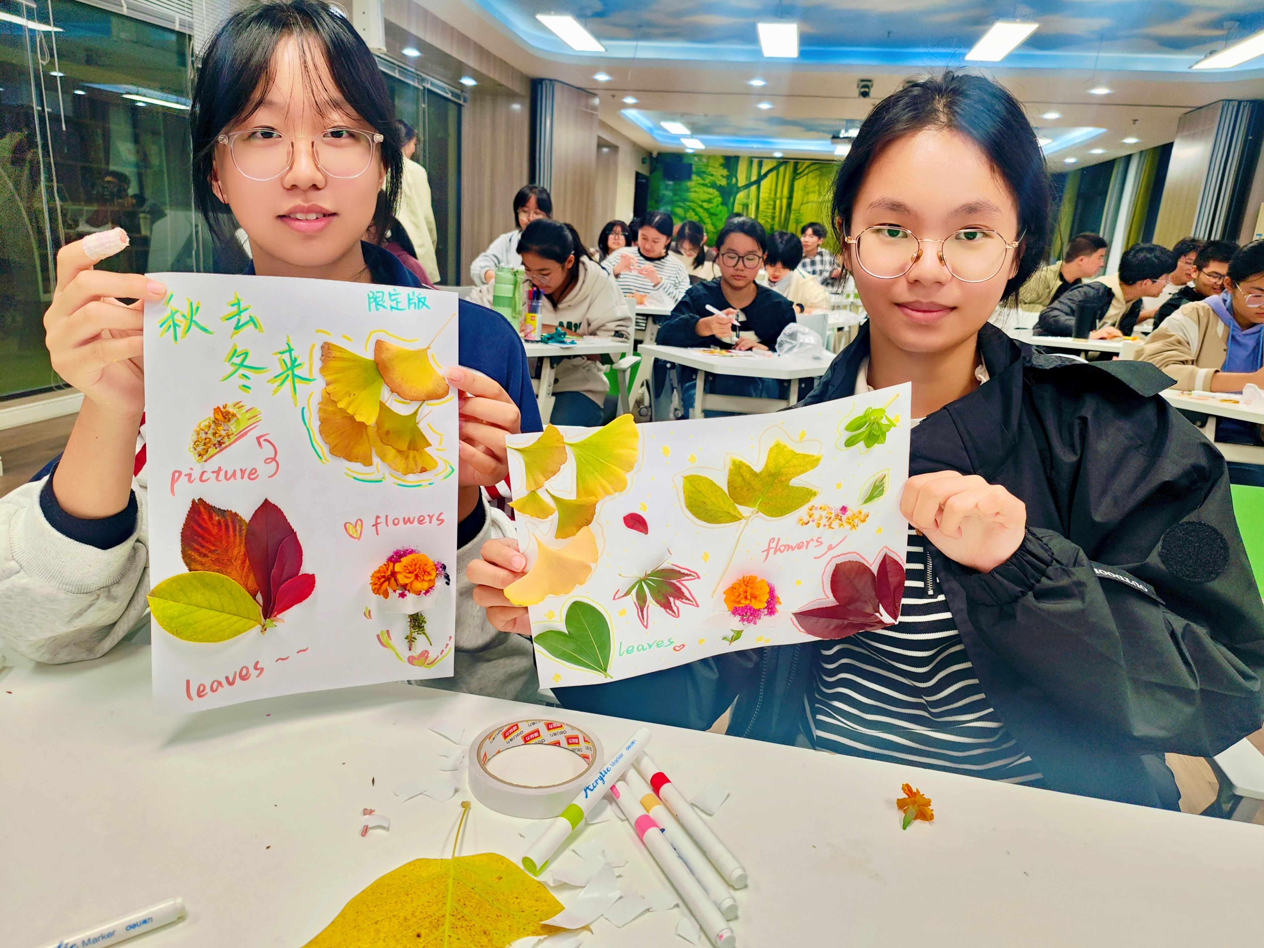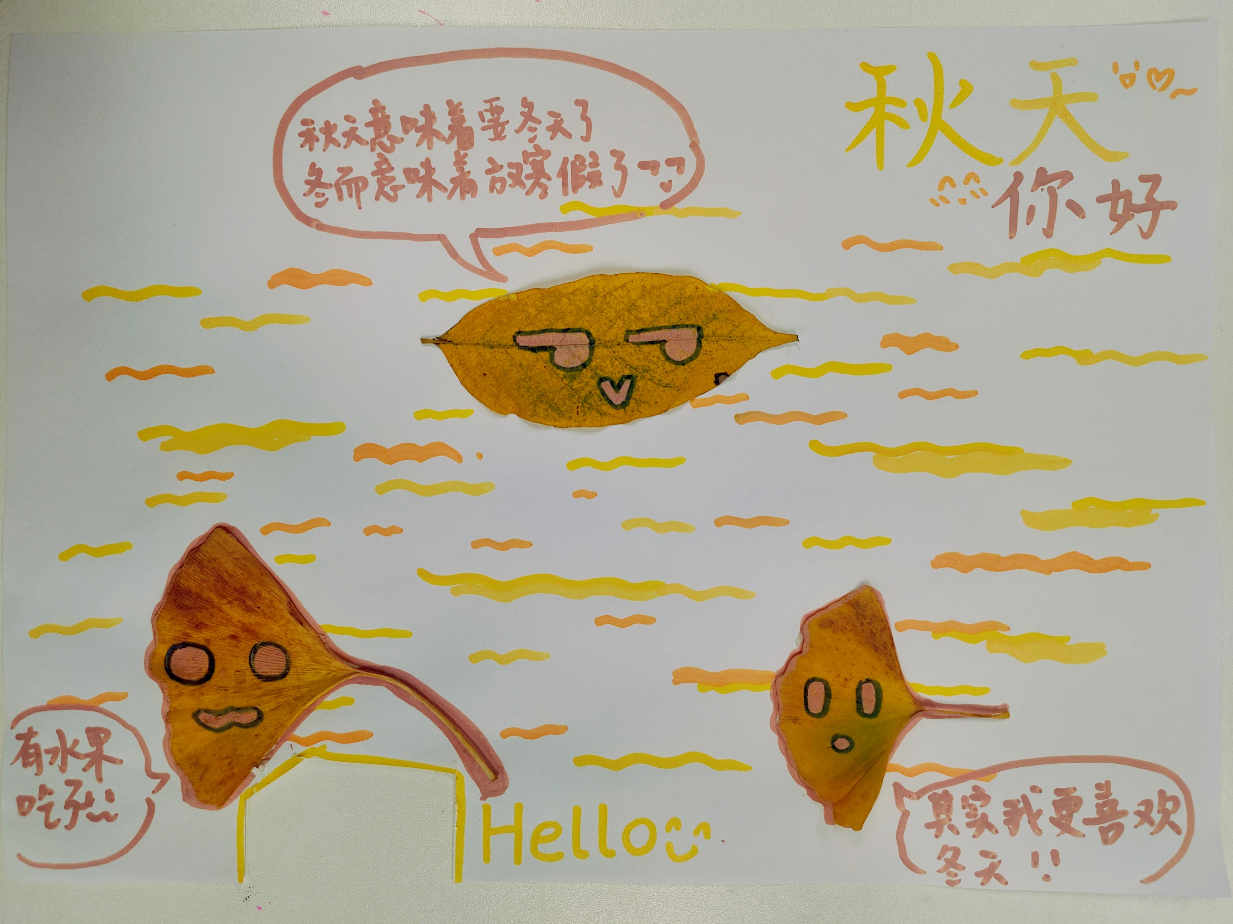 带着收集到的秋日素材,同学们重返活动室,在一张共同的“秋天画布”上,开始创意拼贴与绘画。大家借助树叶、花瓣与彩笔,将眼中的秋天、心中的季节,转化为一幅幅充满个性的作品。有同学用层层叠叠的落叶拼出“时间的年轮”,也有同学以金黄与深褐绘出“暖光与寒枝的交界”。