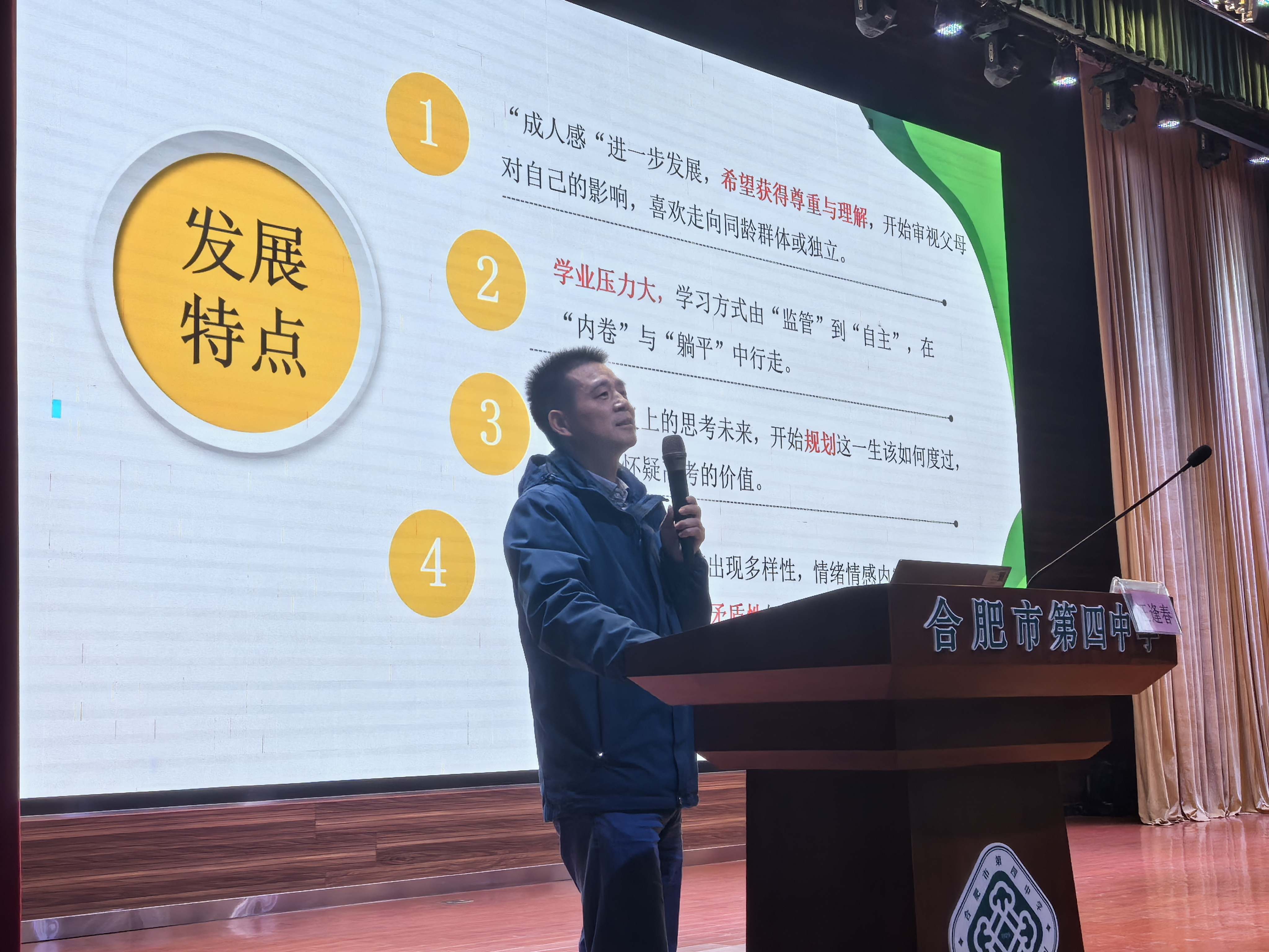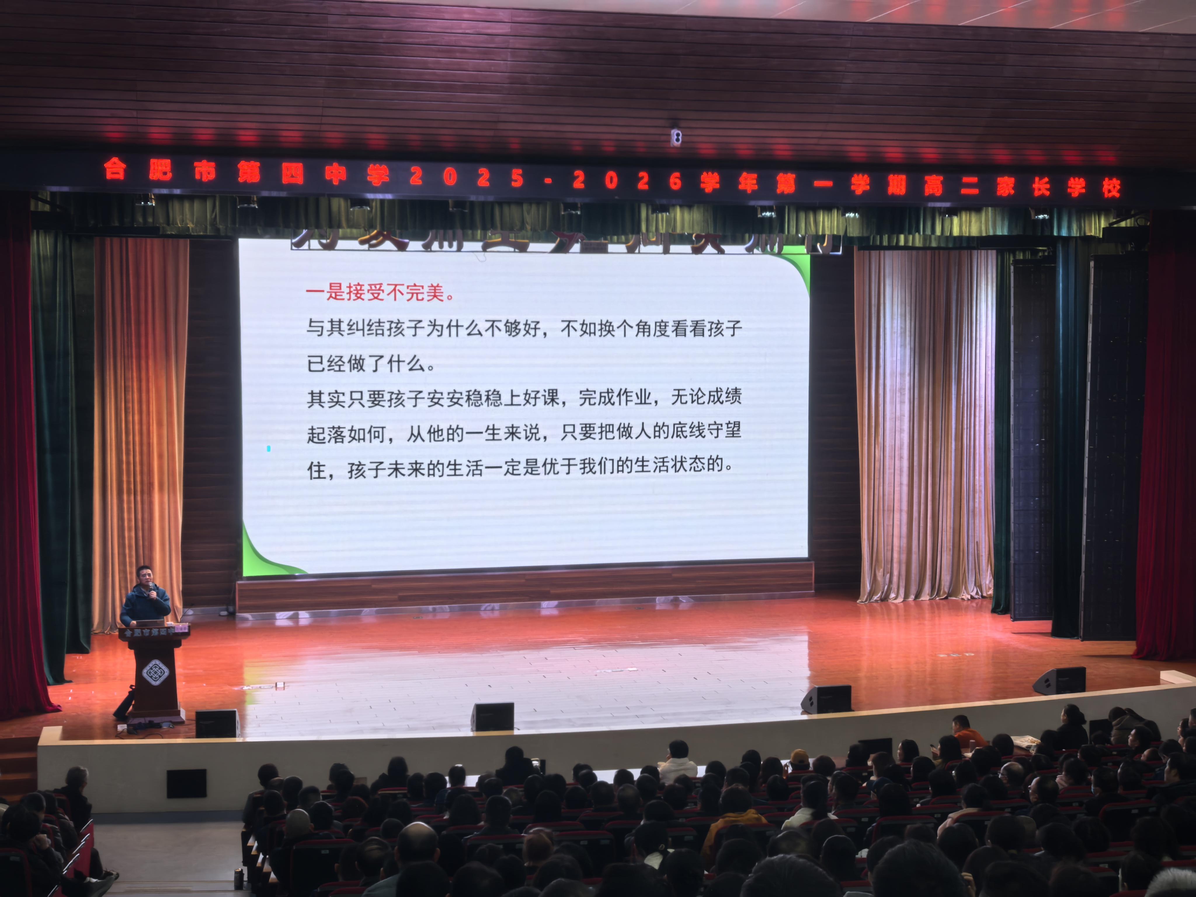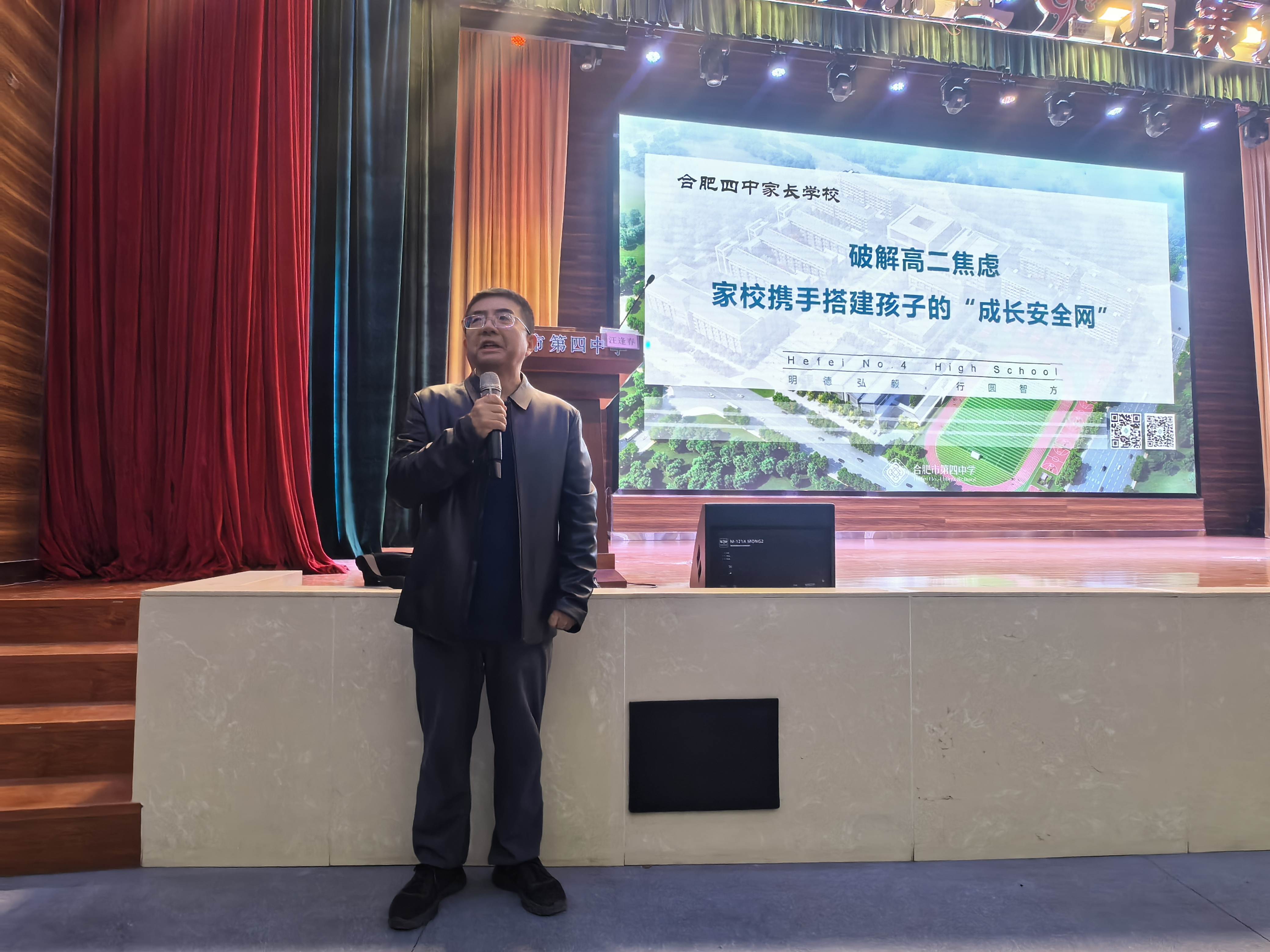 2025年11月30日下午,合肥四中邀请了合肥市教育局家庭教育专家团成员、合肥四中政教处主任汪逢春为高二年级家长开展了一期家长学校专题讲座——《破解高二焦虑:家校携手搭建孩子的成长安全网》,讲座在中和会堂举行,副校长赵勇、年级部李全鹏主任、学生处陈园园副主任出席本次讲座。